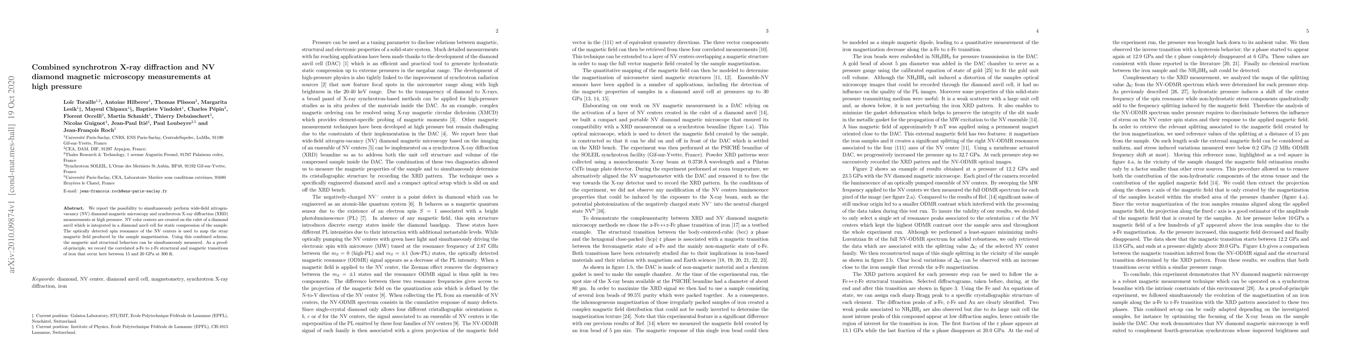 This paper demonstrates a novel method combining synchrotron X-ray diffraction and NV diamond magnetic microscopy to simultaneously measure structural and magnetic behaviors under high pressure. The study successfully correlates the structural and magnetic transitions of iron between 15 and 20 GPa, showcasing the potential of this integrated approach.