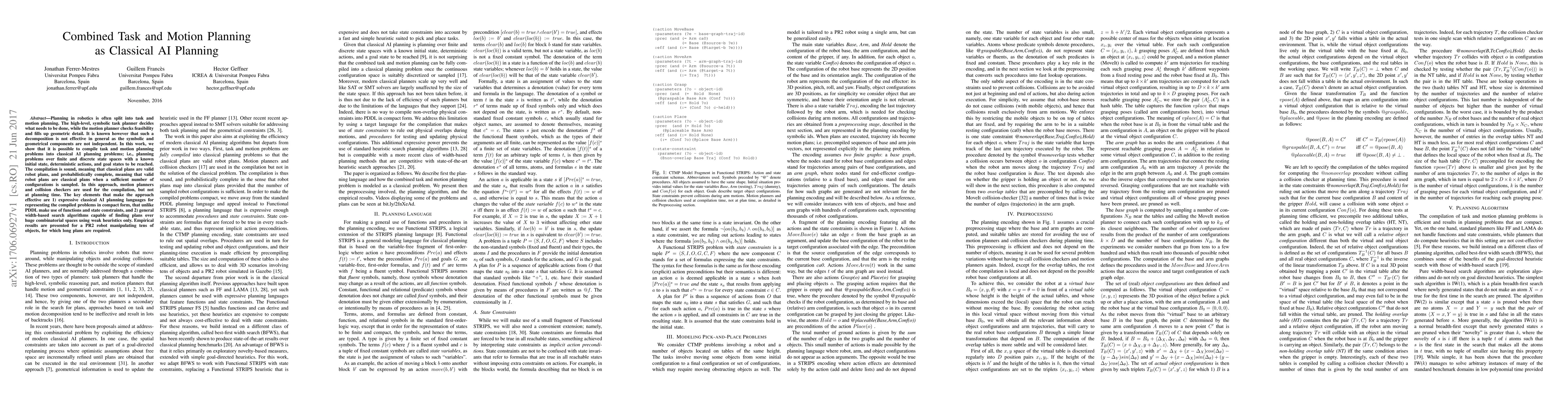 This paper proposes a method to combine task and motion planning into classical AI planning, demonstrating that these traditionally separate tasks can be compiled into finite, discrete planning problems. The approach uses expressive planning languages and width-based search algorithms to efficiently handle large combinatorial spaces, validated through experiments on a PR2 robot.