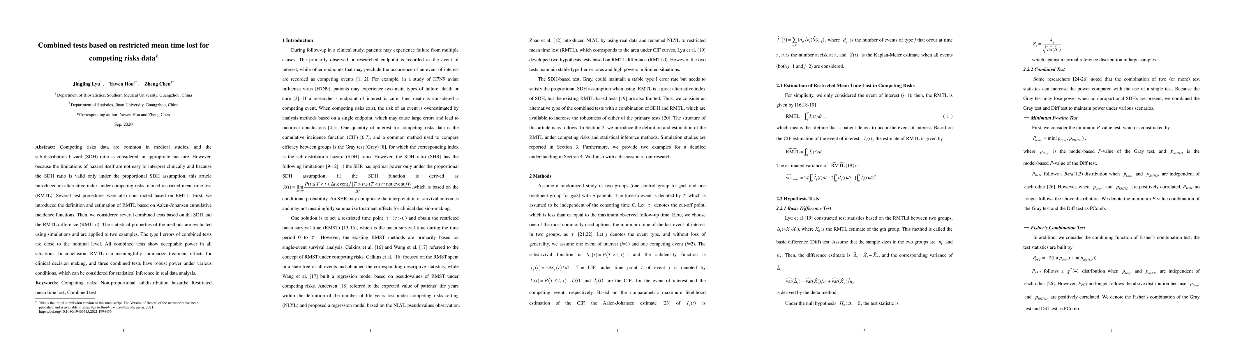 This paper introduces the restricted mean time lost (RMTL) as an alternative measure to the sub-distribution hazard ratio for competing risks data, proposing several combined test procedures based on RMTL. The proposed methods are shown to have robust statistical properties and acceptable power, making them useful for clinical decision-making in medical studies.