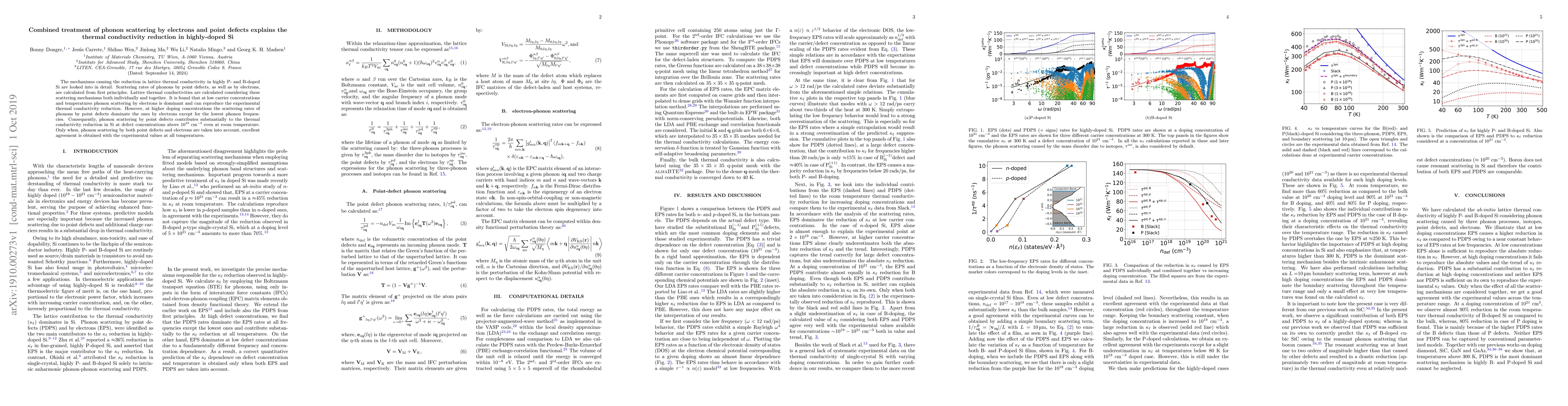 This paper investigates the combined effects of phonon scattering by electrons and point defects on the thermal conductivity reduction in highly-doped silicon. It finds that both mechanisms contribute significantly, with electron scattering dominating at low doping levels and point defects becoming the primary factor at higher doping concentrations above $10^{19}$ cm$^{-3}$.