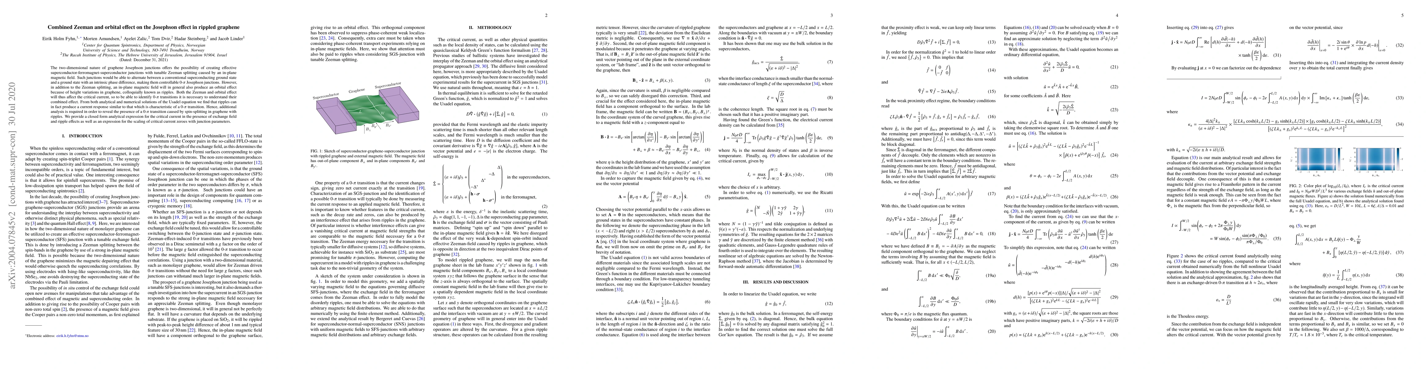 This paper investigates the combined influence of Zeeman and orbital effects on the Josephson effect in rippled graphene, showing that ripples can mimic $0-\pi$ transition characteristics. The study provides analytical and numerical solutions to the Usadel equation, offering a closed-form expression for the critical current under these conditions.