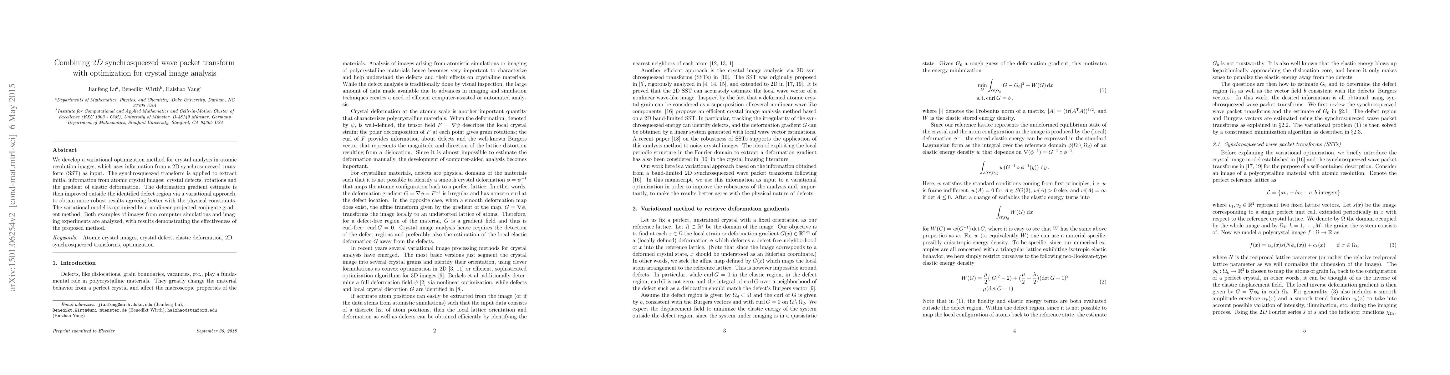This paper proposes a variational optimization method for crystal analysis in atomic resolution images, utilizing a 2D synchrosqueezed transform to extract initial crystal information and a nonlinear projected conjugate gradient method to refine deformation gradient estimates, achieving more robust results. The method is validated through both simulated and experimental images.