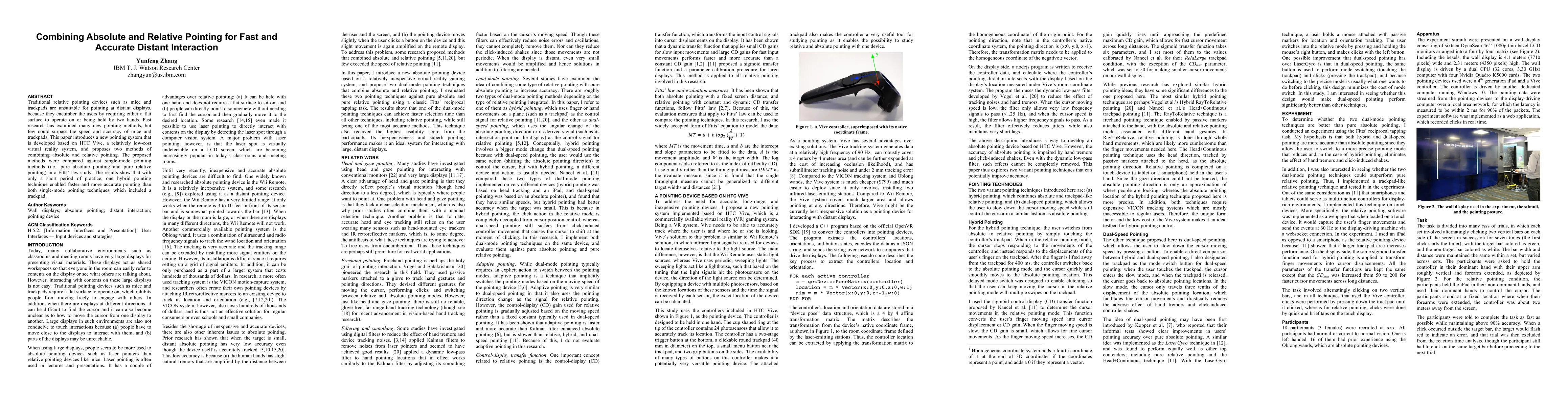 This research proposes a pointing system based on HTC Vive, introducing two dual-mode techniques: hybrid pointing (combining absolute and relative pointing) and dual-speed pointing (allowing users to slow cursor movement). These techniques were compared against single-mode absolute and relative pointing in a Fitts' law study.