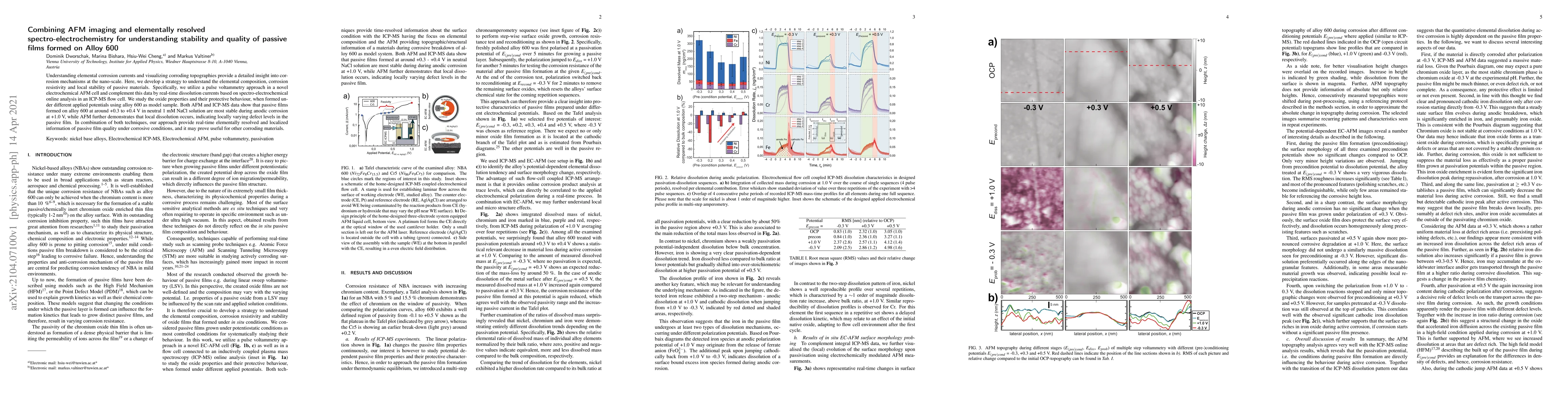 This study combines AFM imaging and ICP-MS spectro-electrochemistry to analyze the stability and quality of passive films on Alloy 600. The results show that films formed at +0.3 to +0.4 V in neutral 1 mM NaCl are most stable under anodic corrosion, with AFM revealing localized dissolution indicating varying defect levels.