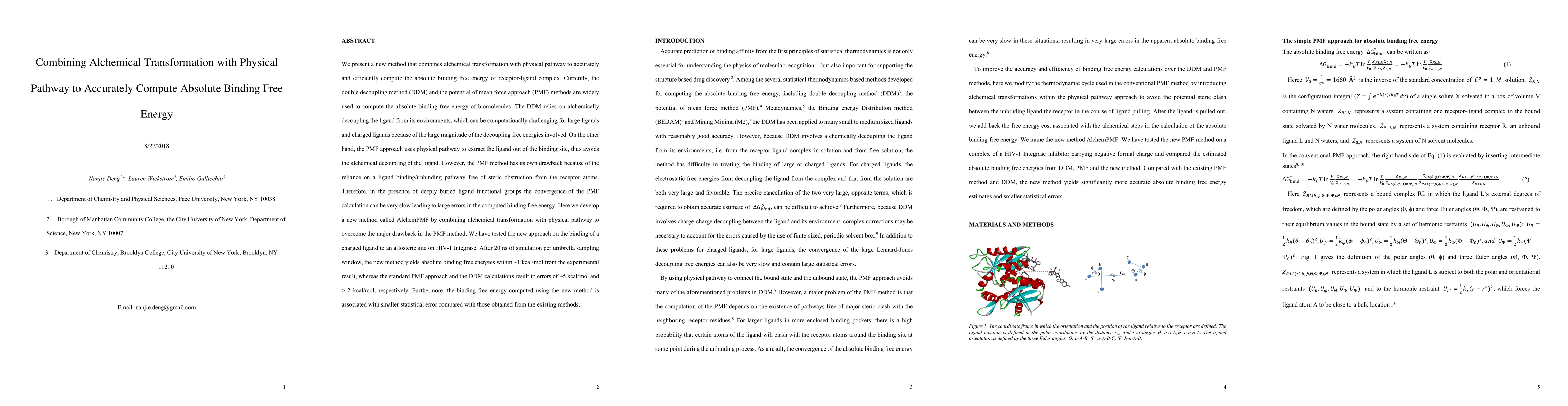 This paper introduces a novel method called AlchemPMF that combines alchemical transformation with a physical pathway to accurately compute absolute binding free energy of receptor-ligand complexes. The new method outperforms existing approaches like DDM and PMF, achieving results within ~1 kcal/mol of experimental values compared to errors of ~5 kcal/mol and > 2 kcal/mol from the standard methods, respectively.