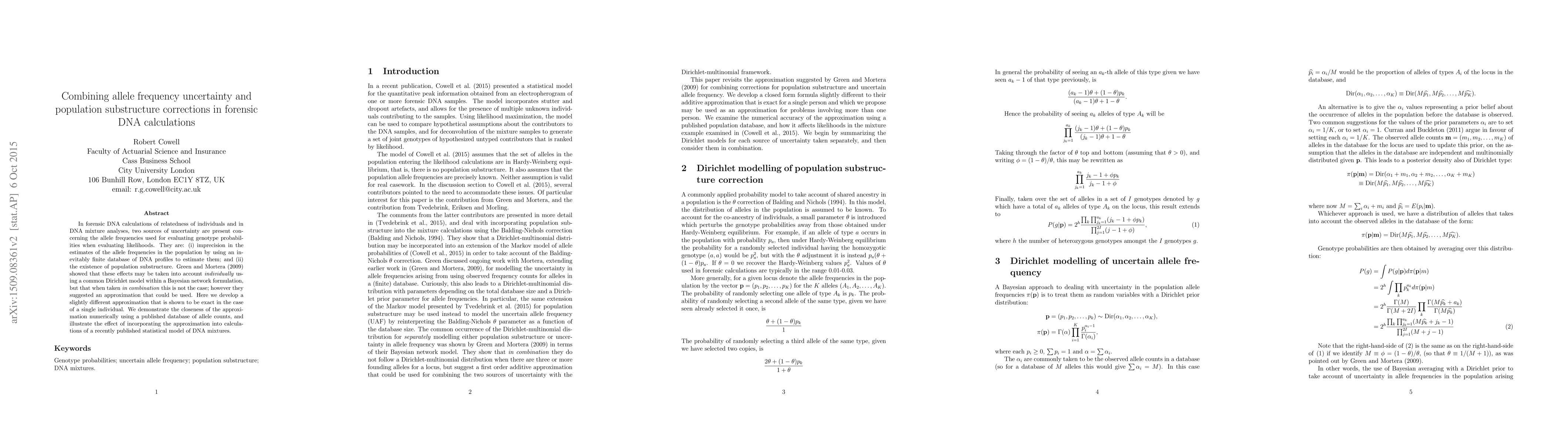 In forensic DNA calculations of relatedness of individuals and in DNA mixture analyses, two sources of uncertainty are present concerning the allele frequencies used for evaluating genotype probabilities when evaluating likelihoods. They are: (i) imprecision in the estimates of the allele frequencies in the population by using an inevitably finite database of DNA profiles to estimate them; and (ii) the existence of population substructure. Green and Mortera (2009) showed that these effects may be taken into account individually using a common Dirichlet model within a Bayesian network formulation, but that when taken in combination this is not the case; however they suggested an approximation that could be used. Here we develop a slightly different approximation that is shown to be exact in the case of a single individual. We demonstrate the closeness of the approximation numerically using a published database of allele counts, and illustrate the effect of incorporating the approximation into calculations of a recently published statistical model of DNA mixtures.