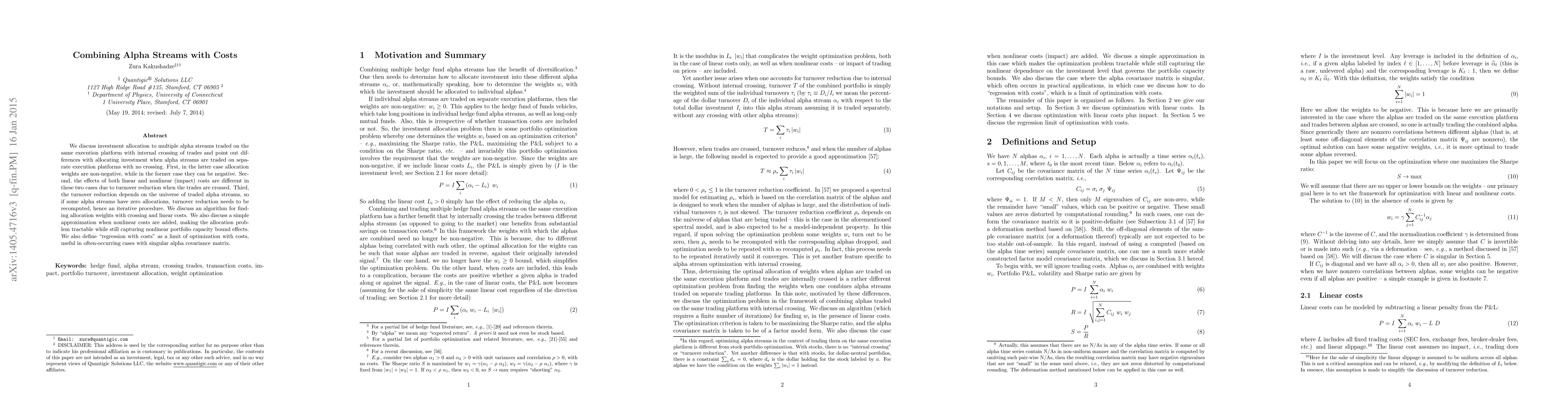 We discuss investment allocation to multiple alpha streams traded on the same execution platform with internal crossing of trades and point out differences with allocating investment when alpha streams are traded on separate execution platforms with no crossing. First, in the latter case allocation weights are non-negative, while in the former case they can be negative. Second, the effects of both linear and nonlinear (impact) costs are different in these two cases due to turnover reduction when the trades are crossed. Third, the turnover reduction depends on the universe of traded alpha streams, so if some alpha streams have zero allocations, turnover reduction needs to be recomputed, hence an iterative procedure. We discuss an algorithm for finding allocation weights with crossing and linear costs. We also discuss a simple approximation when nonlinear costs are added, making the allocation problem tractable while still capturing nonlinear portfolio capacity bound effects. We also define "regression with costs" as a limit of optimization with costs, useful in often-occurring cases with singular alpha covariance matrix.