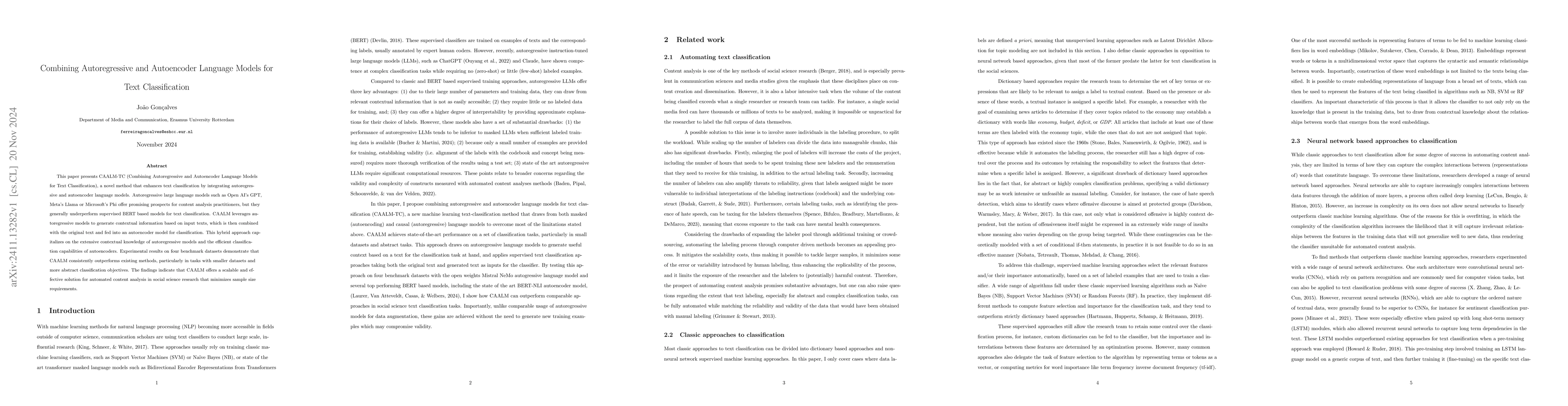 This paper introduces CAALM-TC, combining autoregressive and autoencoder language models to improve text classification, showing better performance on smaller datasets. CAALM leverages autoregressive models for contextual information and autoencoders for classification, outperforming existing methods.