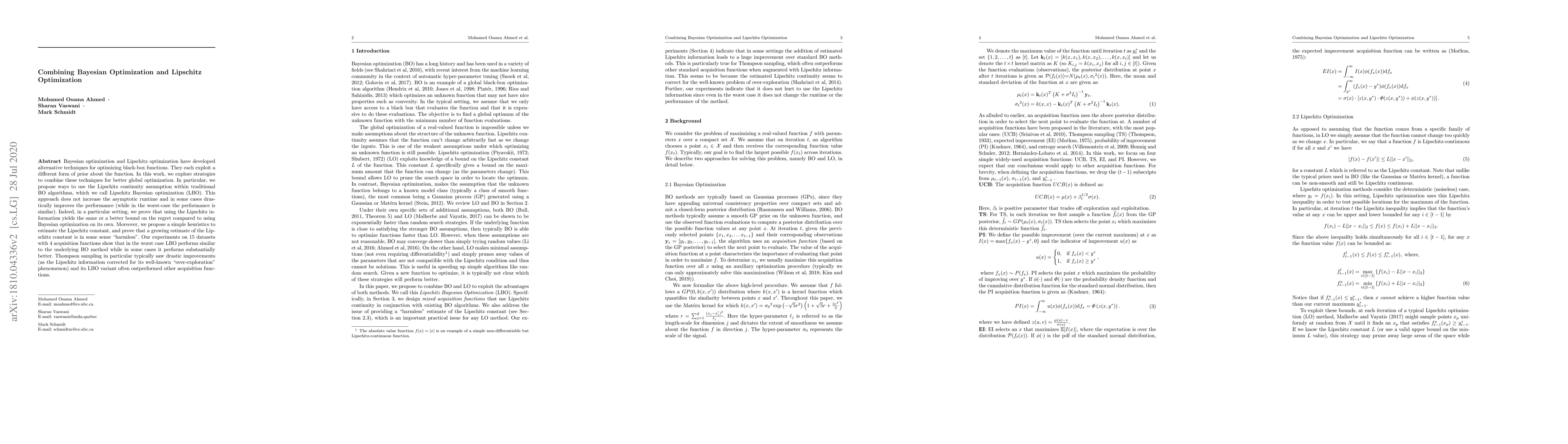 Bayesian optimization and Lipschitz optimization have developed alternative techniques for optimizing black-box functions. They each exploit a different form of prior about the function. In this work, we explore strategies to combine these techniques for better global optimization. In particular, we propose ways to use the Lipschitz continuity assumption within traditional BO algorithms, which we call Lipschitz Bayesian optimization (LBO). This approach does not increase the asymptotic runtime and in some cases drastically improves the performance (while in the worst-case the performance is similar). Indeed, in a particular setting, we prove that using the Lipschitz information yields the same or a better bound on the regret compared to using Bayesian optimization on its own. Moreover, we propose a simple heuristics to estimate the Lipschitz constant, and prove that a growing estimate of the Lipschitz constant is in some sense ``harmless''. Our experiments on 15 datasets with 4 acquisition functions show that in the worst case LBO performs similar to the underlying BO method while in some cases it performs substantially better. Thompson sampling in particular typically saw drastic improvements (as the Lipschitz information corrected for its well-known ``over-exploration'' phenomenon) and its LBO variant often outperformed other acquisition functions.