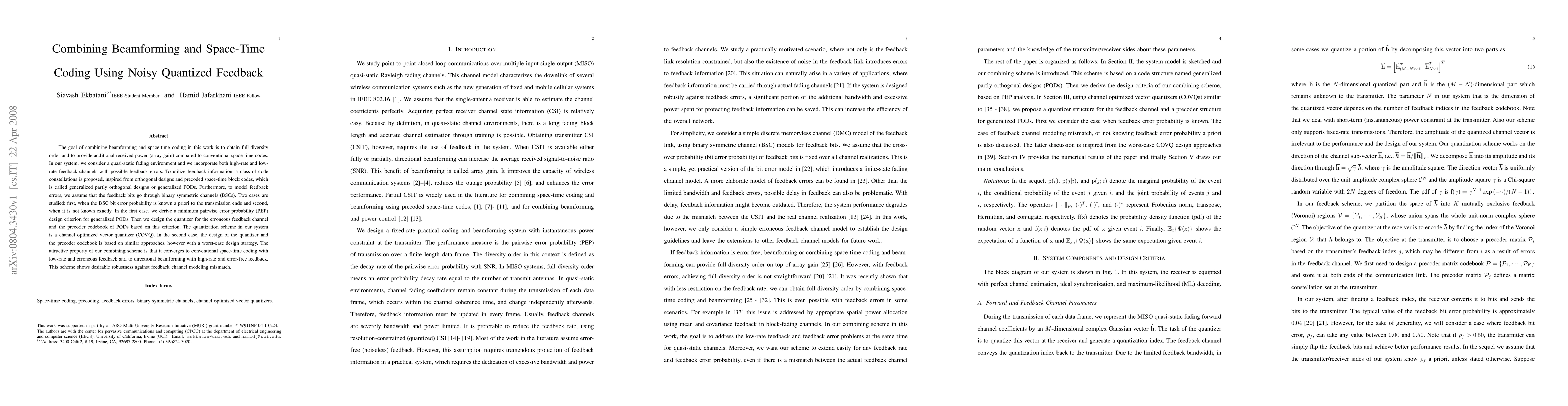 The goal of combining beamforming and space-time coding in this work is to obtain full-diversity order and to provide additional received power (array gain) compared to conventional space-time codes. In our system, we consider a quasi-static fading environment and we incorporate both high-rate and low-rate feedback channels with possible feedback errors. To utilize feedback information, a class of code constellations is proposed, inspired from orthogonal designs and precoded space-time block codes, which is called generalized partly orthogonal designs or generalized PODs. Furthermore, to model feedback errors, we assume that the feedback bits go through binary symmetric channels (BSCs). Two cases are studied: first, when the BSC bit error probability is known a priori to the transmission ends and second, when it is not known exactly. In the first case, we derive a minimum pairwise error probability (PEP) design criterion for generalized PODs. Then we design the quantizer for the erroneous feedback channel and the precoder codebook of PODs based on this criterion. The quantization scheme in our system is a channel optimized vector quantizer (COVQ). In the second case, the design of the quantizer and the precoder codebook is based on similar approaches, however with a worst-case design strategy. The attractive property of our combining scheme is that it converges to conventional space-time coding with low-rate and erroneous feedback and to directional beamforming with high-rate and error-free feedback. This scheme shows desirable robustness against feedback channel modeling mismatch.
