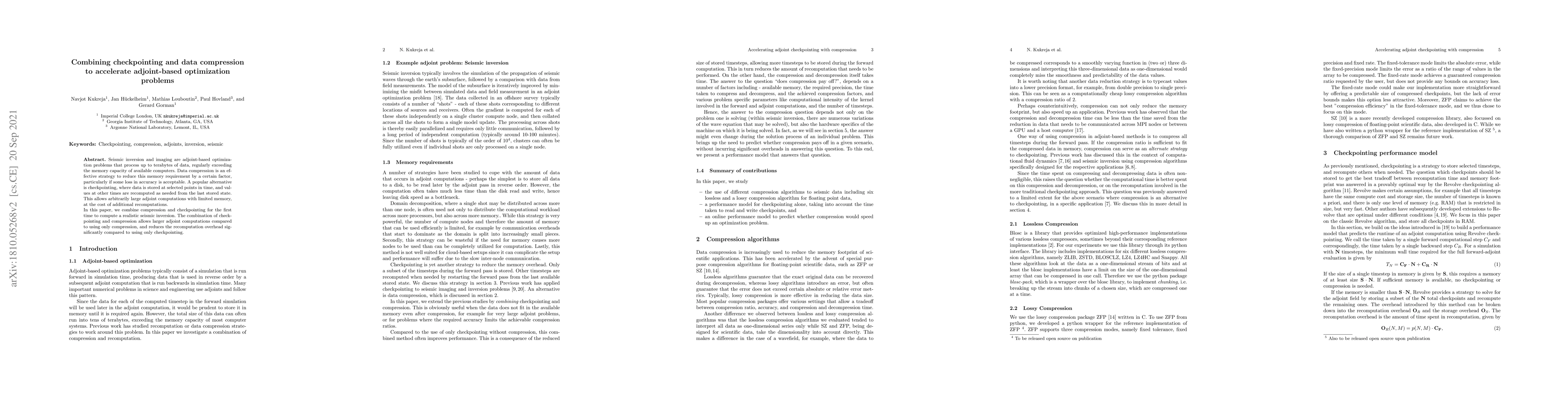 This paper proposes a novel method combining data compression and checkpointing to tackle large-scale adjoint-based optimization problems, such as seismic inversion, by reducing memory requirements and minimizing recomputation overhead. The integrated approach enables larger computations than either method alone.
