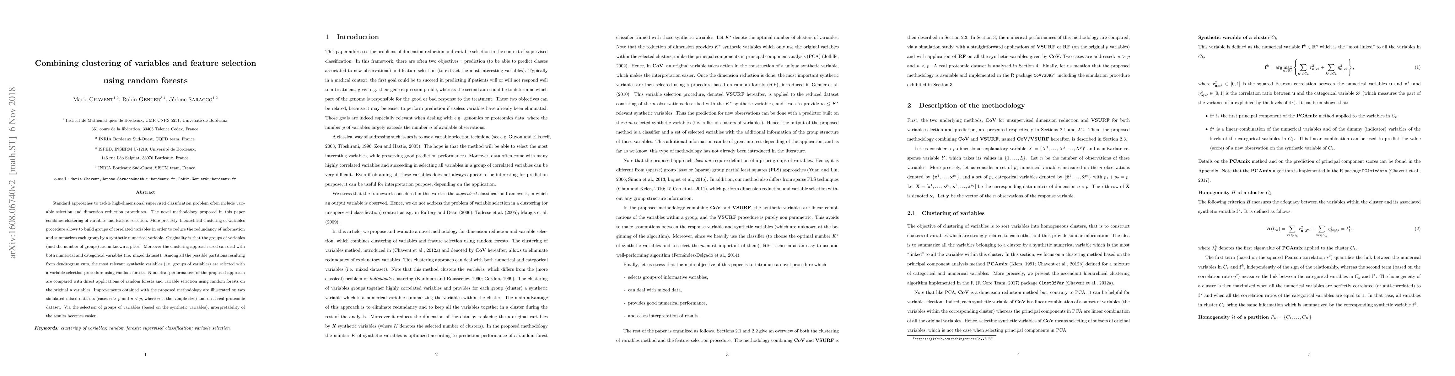 Standard approaches to tackle high-dimensional supervised classification problem often include variable selection and dimension reduction procedures. The novel methodology proposed in this paper combines clustering of variables and feature selection. More precisely, hierarchical clustering of variables procedure allows to build groups of correlated variables in order to reduce the redundancy of information and summarizes each group by a synthetic numerical variable. Originality is that the groups of variables (and the number of groups) are unknown a priori. Moreover the clustering approach used can deal with both numerical and categorical variables (i.e. mixed dataset). Among all the possible partitions resulting from dendrogram cuts, the most relevant synthetic variables (i.e. groups of variables) are selected with a variable selection procedure using random forests. Numerical performances of the proposed approach are compared with direct applications of random forests and variable selection using random forests on the original p variables. Improvements obtained with the proposed methodology are illustrated on two simulated mixed datasets (cases n>p and n