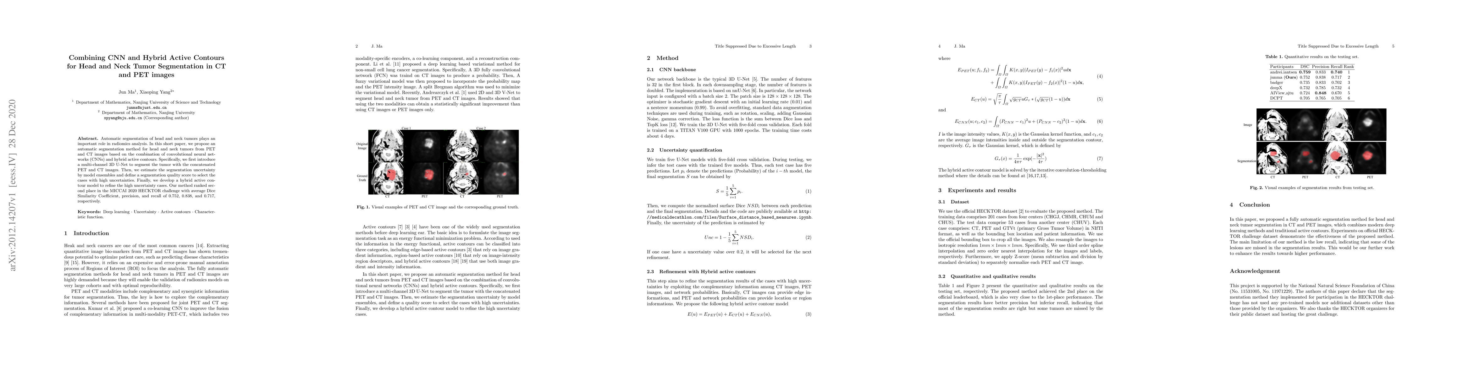 This paper proposes an automated method for segmenting head and neck tumors using a combination of CNNs and hybrid active contours on PET and CT images. The method achieved high performance in the MICCAI 2020 HECKTOR challenge, ranking second with notable Dice Similarity Coefficient, precision, and recall metrics.