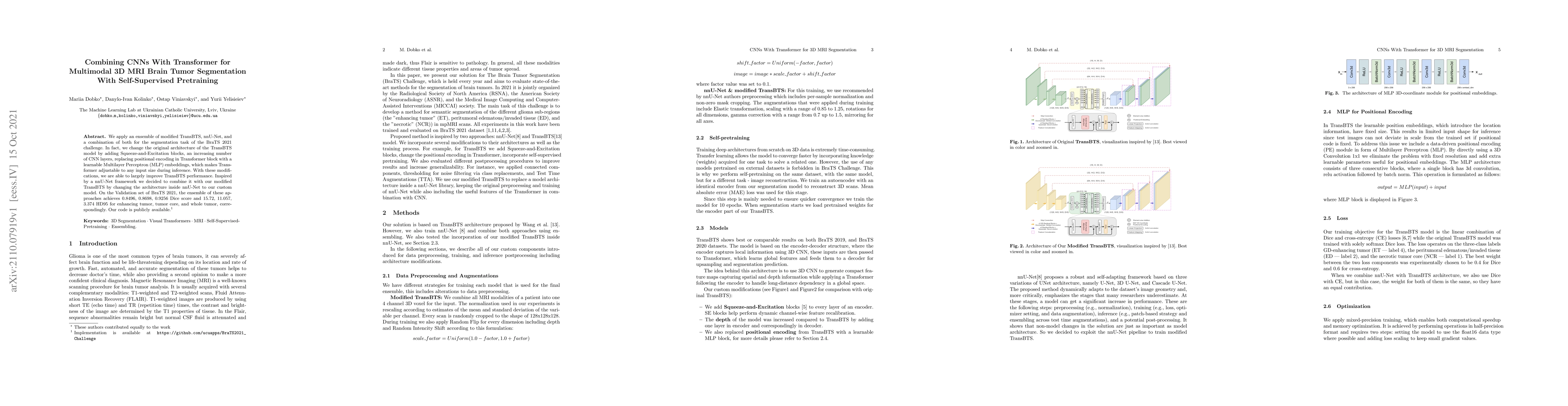 This paper combines CNNs and Transformers with self-supervised pretraining to enhance 3D MRI brain tumor segmentation for the BraTS 2021 challenge. The modified TransBTS model, integrated with nnU-Net, achieves improved Dice scores and HD95 metrics on the validation set.