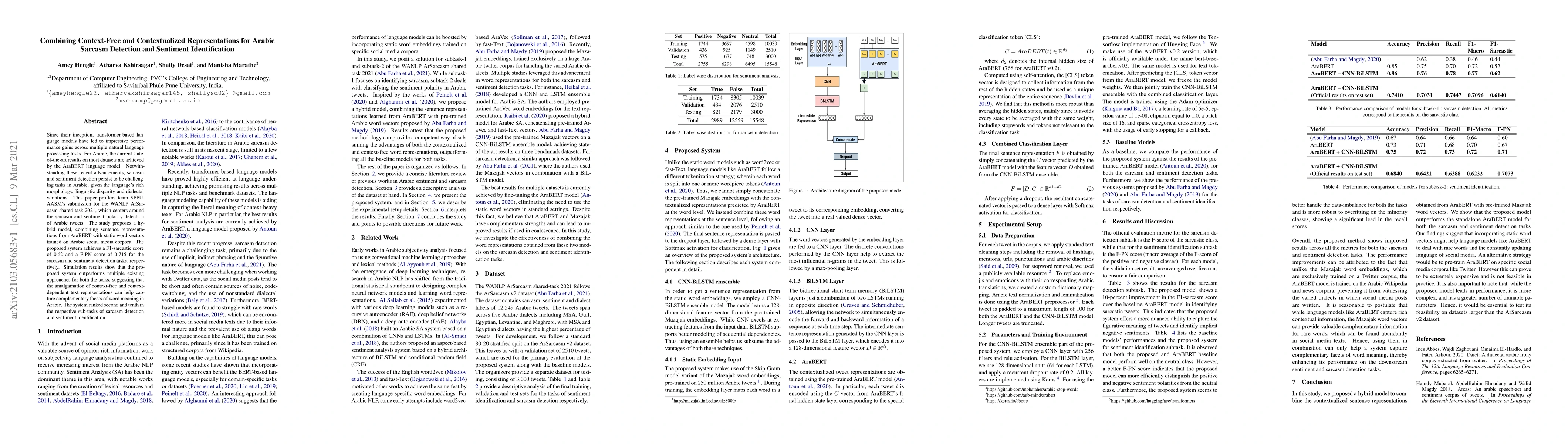Since their inception, transformer-based language models have led to impressive performance gains across multiple natural language processing tasks. For Arabic, the current state-of-the-art results on most datasets are achieved by the AraBERT language model. Notwithstanding these recent advancements, sarcasm and sentiment detection persist to be challenging tasks in Arabic, given the language's rich morphology, linguistic disparity and dialectal variations. This paper proffers team SPPU-AASM's submission for the WANLP ArSarcasm shared-task 2021, which centers around the sarcasm and sentiment polarity detection of Arabic tweets. The study proposes a hybrid model, combining sentence representations from AraBERT with static word vectors trained on Arabic social media corpora. The proposed system achieves a F1-sarcastic score of 0.62 and a F-PN score of 0.715 for the sarcasm and sentiment detection tasks, respectively. Simulation results show that the proposed system outperforms multiple existing approaches for both the tasks, suggesting that the amalgamation of context-free and context-dependent text representations can help capture complementary facets of word meaning in Arabic. The system ranked second and tenth in the respective sub-tasks of sarcasm detection and sentiment identification.