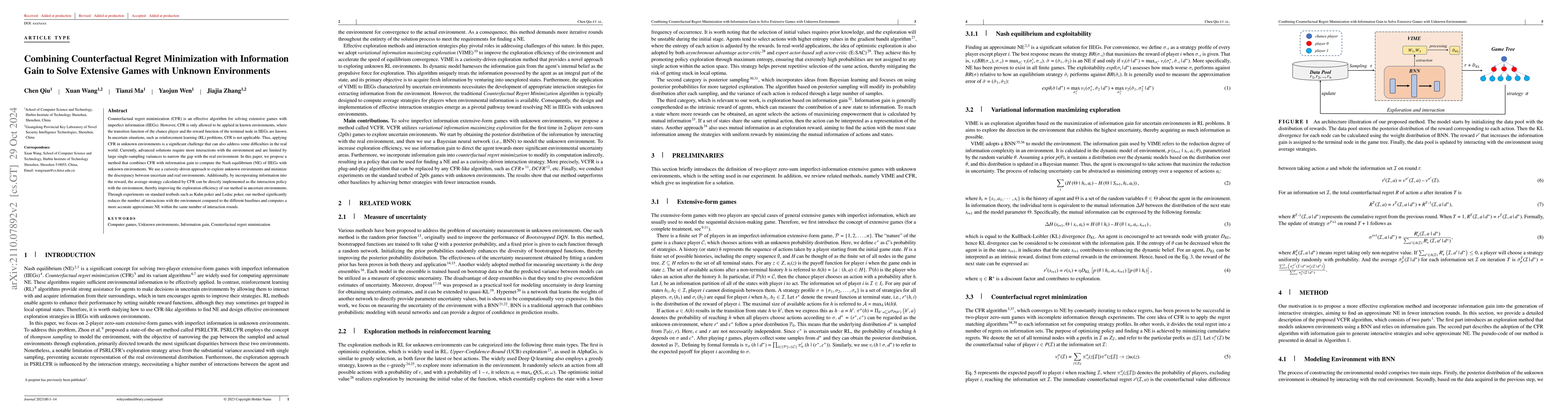 This paper proposes VCFR, a novel method combining Counterfactual Regret Minimization (CFR) with information gain to solve extensive games with imperfect information under Reinforcement Learning. The approach enhances exploration efficiency and effectively reduces interactions with the environment, achieving an approximate Nash Equilibrium.