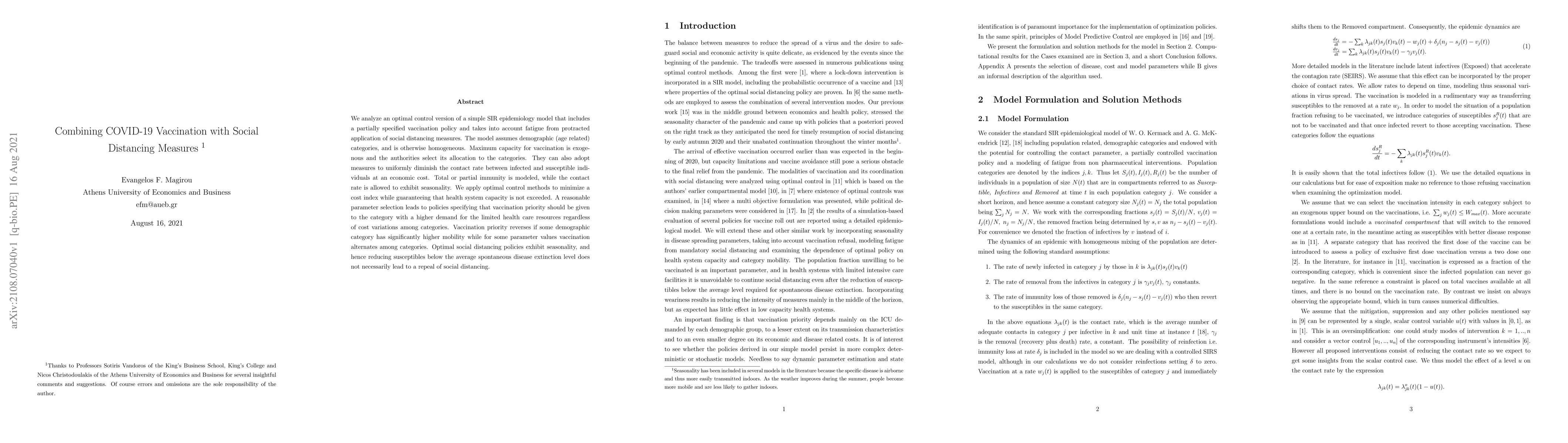 We analyze an optimal control version of a simple SIR epidemiology model that includes a partially specified vaccination policy and takes into account fatigue from protracted application of social distancing measures. The model assumes demographic (age related) categories, and is otherwise homogeneous. Maximum capacity for vaccination is exogenous and the authorities select its allocation to the categories. They can also adopt measures to uniformly diminish the contact rate between infected and susceptible individuals at an economic cost. Total or partial immunity is modeled, while the contact rate is allowed to exhibit seasonality. We apply optimal control methods to minimize a cost index while guaranteeing that health system capacity is not exceeded. A reasonable parameter selection leads to policies specifying that vaccination priority should be given to the category with a higher demand for the limited health care resources regardless of cost variations among categories. Vaccination priority reverses if some demographic category has significantly higher mobility while for some parameter values vaccination alternates among categories. Optimal social distancing policies exhibit seasonality, and hence reducing susceptibles below the average spontaneous disease extinction level does not necessarily lead to a repeal of social distancing.