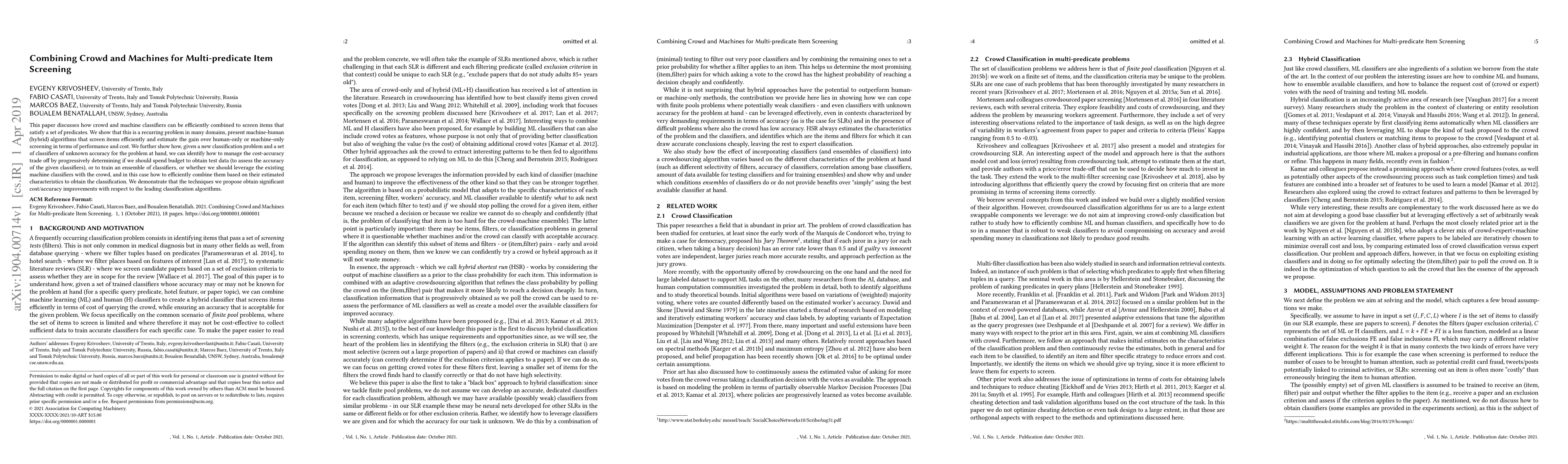 This paper proposes hybrid algorithms combining crowd and machine classifiers for efficient multi-predicate item screening, demonstrating significant cost/accuracy improvements over human-only or machine-only approaches. It also presents a method to manage the cost-accuracy trade-off by determining the optimal use of budget for test data, classifier training, or crowd-machine collaboration.