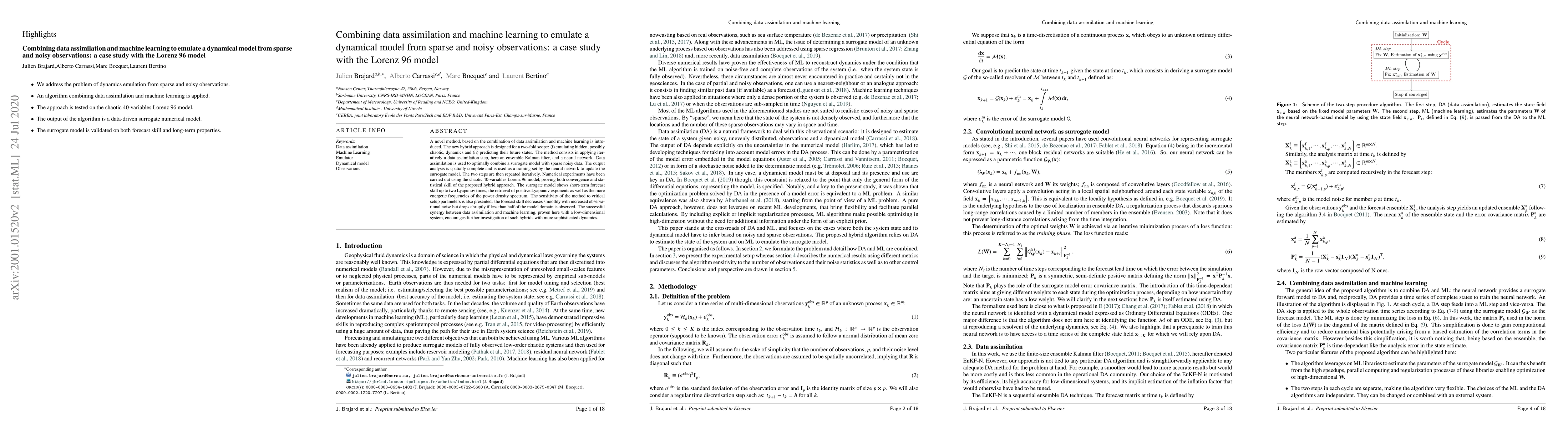This paper introduces a hybrid method combining data assimilation and machine learning to emulate chaotic dynamics and predict future states. Using the Lorenz 96 model, the approach iteratively integrates an ensemble Kalman filter and a neural network, demonstrating convergence and short-term forecast skill up to two Lyapunov times. The method's sensitivity to observational noise and coverage is also discussed.