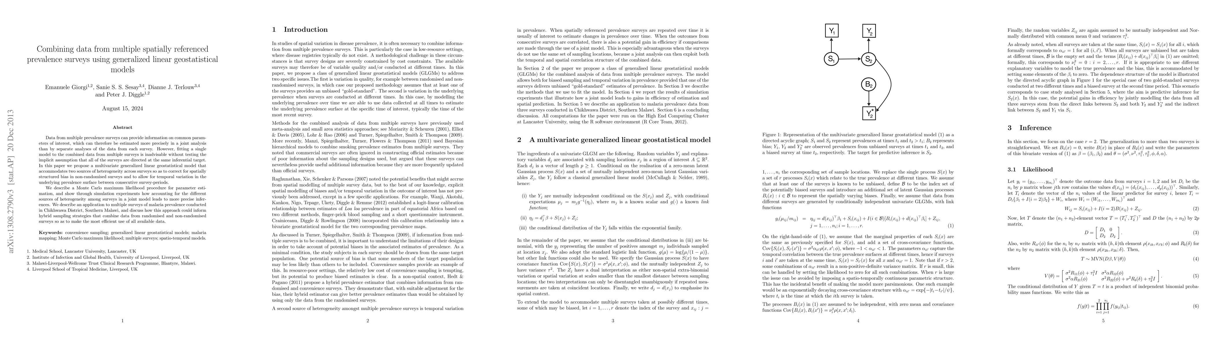 Data from multiple prevalence surveys can provide information on common parameters of interest, which can therefore be estimated more precisely in a joint analysis than by separate analyses of the data from each survey. However, fitting a single model to the combined data from multiple surveys is inadvisable without testing the implicit assumption that all of the surveys are directed at the same inferential target. In this paper we propose a multivariate generalized linear geostatistical model that accommodates two sources of heterogeneity across surveys so as to correct for spatially structured bias in non-randomised surveys and to allow for temporal variation in the underlying prevalence surface between consecutive survey-periods. We describe a Monte Carlo maximum likelihood procedure for parameter estimation, and show through simulation experiments how accounting for the different sources of heterogeneity among surveys in a joint model leads to more precise inferences. We describe an application to multiple surveys of malaria prevalence conducted in Chikhwawa District, Southern Malawi, and discuss how this approach could inform hybrid sampling strategies that combine data from randomised and non-randomised surveys so as to make the most efficient use of all available data.