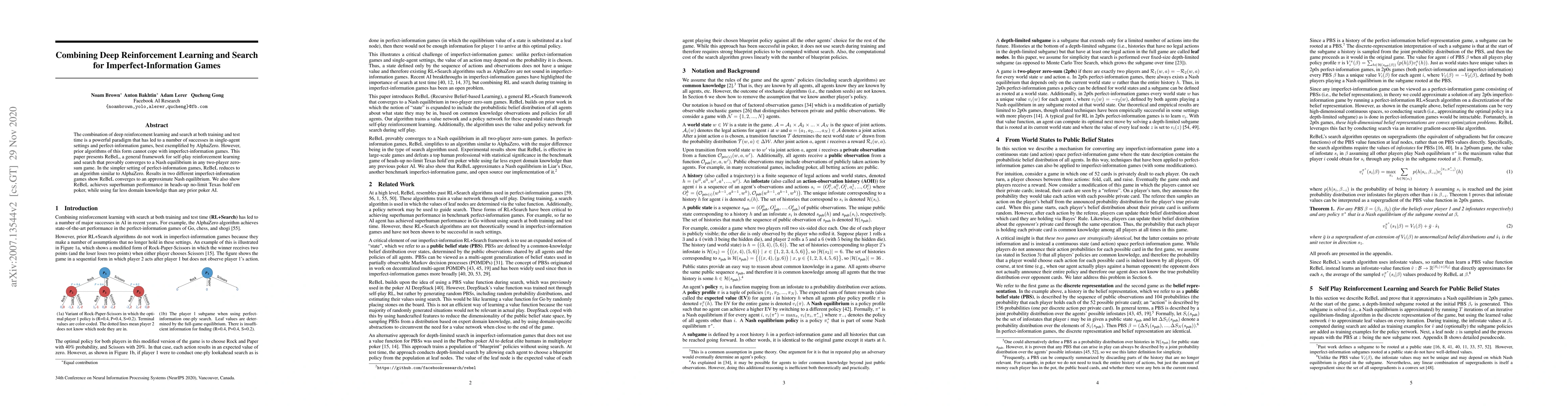 This paper introduces ReBeL, a novel framework combining deep reinforcement learning and search for solving imperfect-information games, which converges to a Nash equilibrium. In perfect-information settings, it mimics AlphaZero, and demonstrates superhuman poker performance using minimal domain knowledge.