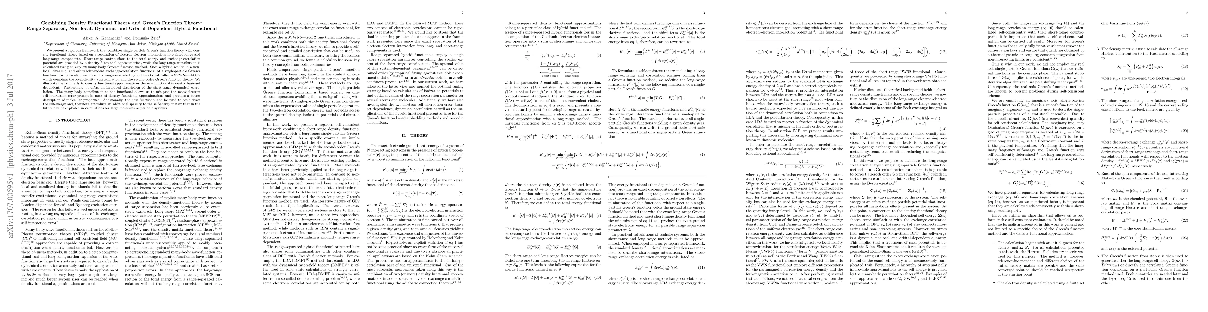 This paper introduces a hybrid functional combining density functional theory with Green's function theory to separate electron-electron interactions into short-range and long-range components, resulting in a nonlocal, dynamic, and orbital-dependent functional. The proposed srSVWN5-lrGF2 functional improves short-range dynamical correlation and mitigates self-interaction errors, offering better molecular property descriptions.