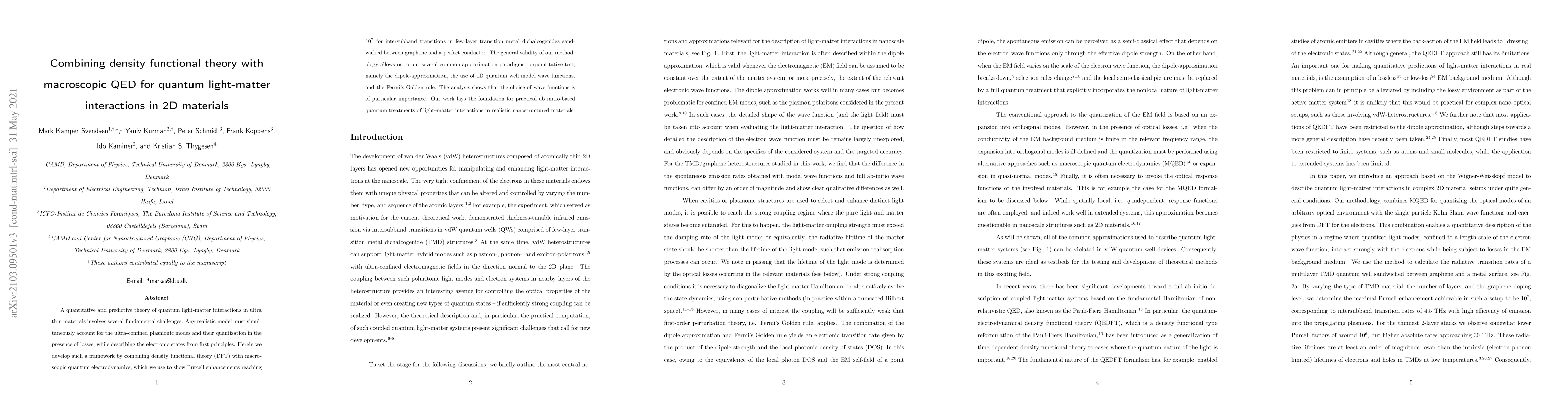 A quantitative and predictive theory of quantum light-matter interactions in ultra thin materials involves several fundamental challenges. Any realistic model must simultaneously account for the ultra-confined plasmonic modes and their quantization in the presence of losses, while describing the electronic states from first principles. Herein we develop such a framework by combining density functional theory (DFT) with macroscopic quantum electrodynamics, which we use to show Purcell enhancements reaching $10^7$ for intersubband transitions in few-layer transition metal dichalcogenides sandwiched between graphene and a perfect conductor. The general validity of our methodology allows us to put several common approximation paradigms to quantitative test, namely the dipole-approximation, the use of 1D quantum well model wave functions, and the Fermi's Golden rule. The analysis shows that the choice of wave functions is of particular importance. Our work lays the foundation for practical ab initio-based quantum treatments of light matter interactions in realistic nanostructured materials.