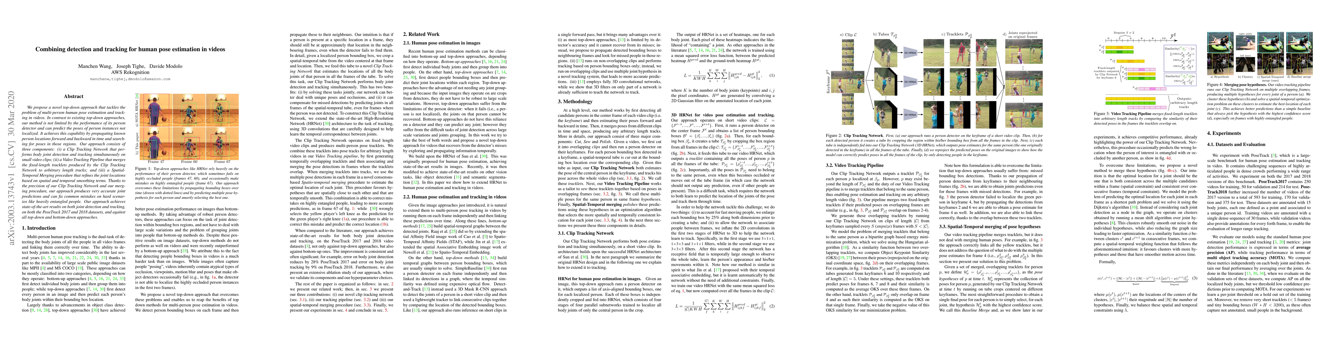 This paper proposes a top-down approach for multi-person human pose estimation and tracking in videos, featuring a Clip Tracking Network, a Video Tracking Pipeline, and a Spatial-Temporal Merging procedure. The method achieves state-of-the-art results on the PoseTrack datasets by accurately predicting joint locations and handling complex scenarios.