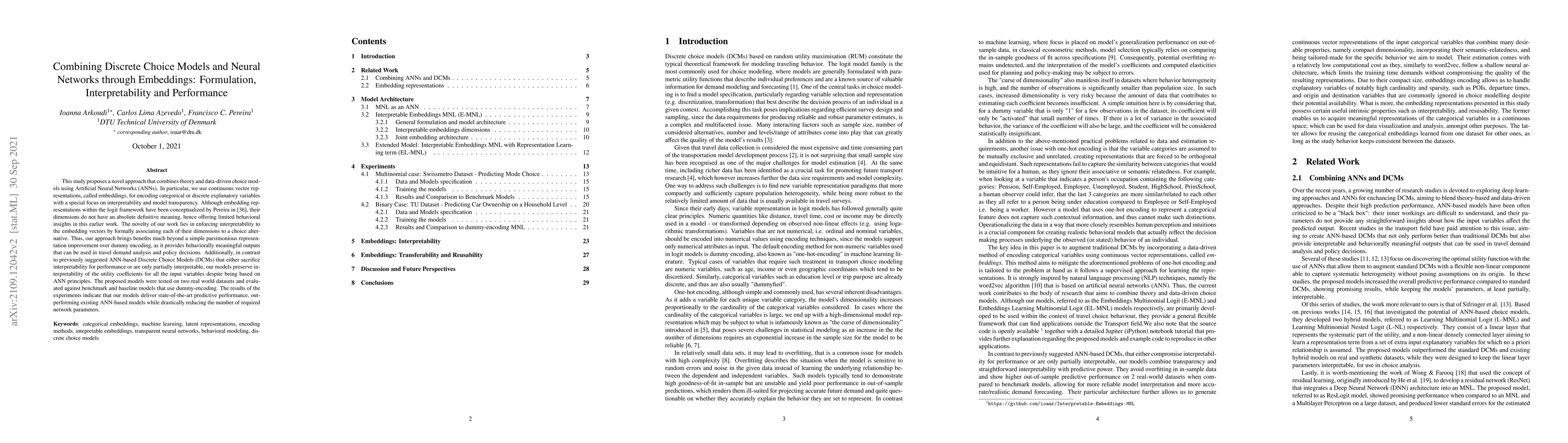 This study proposes a novel approach combining discrete choice models with neural networks using embeddings for better interpretability and performance, outperforming existing models in predictive power while reducing network parameters.