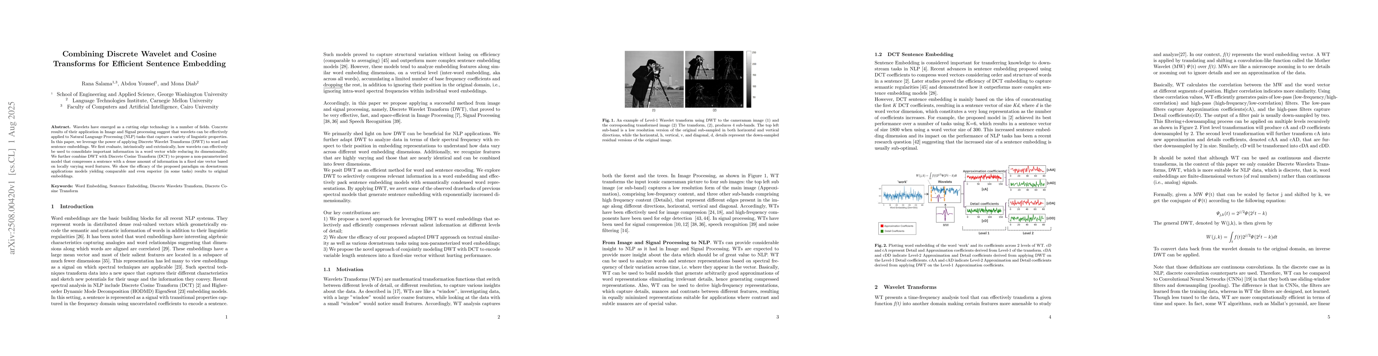 This research presents an efficient method for sentence embedding by combining DWT and DCT, which can effectively capture and compress semantic information, leading to reduced dimensionality without compromising performance. The method's effectiveness is demonstrated across multiple downstream NLP tasks, showing potential for practical applications in natural language processing.