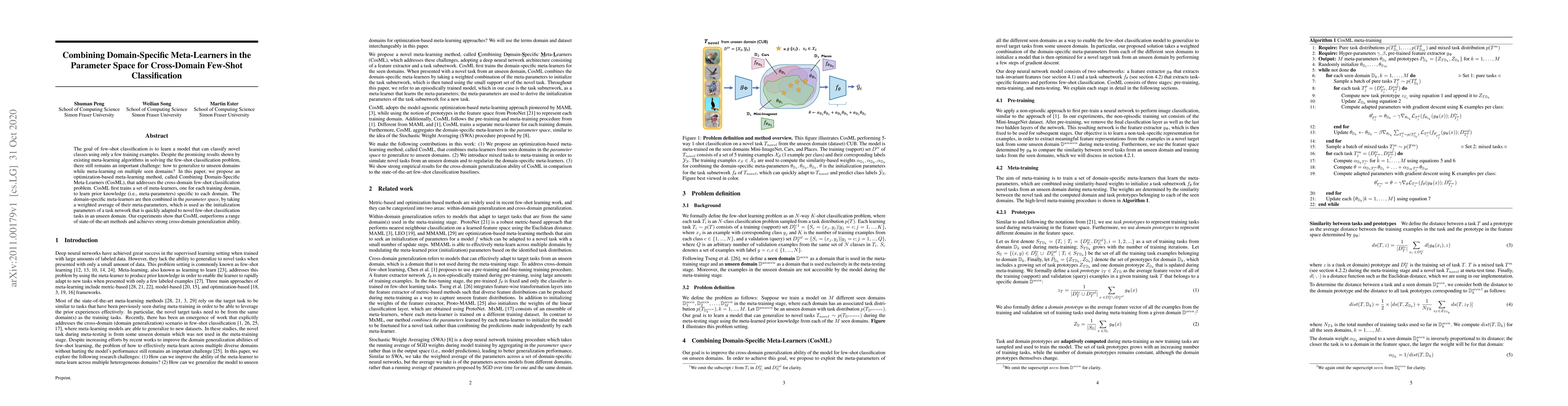 The goal of few-shot classification is to learn a model that can classify novel classes using only a few training examples. Despite the promising results shown by existing meta-learning algorithms in solving the few-shot classification problem, there still remains an important challenge: how to generalize to unseen domains while meta-learning on multiple seen domains? In this paper, we propose an optimization-based meta-learning method, called Combining Domain-Specific Meta-Learners (CosML), that addresses the cross-domain few-shot classification problem. CosML first trains a set of meta-learners, one for each training domain, to learn prior knowledge (i.e., meta-parameters) specific to each domain. The domain-specific meta-learners are then combined in the \emph{parameter space}, by taking a weighted average of their meta-parameters, which is used as the initialization parameters of a task network that is quickly adapted to novel few-shot classification tasks in an unseen domain. Our experiments show that CosML outperforms a range of state-of-the-art methods and achieves strong cross-domain generalization ability.