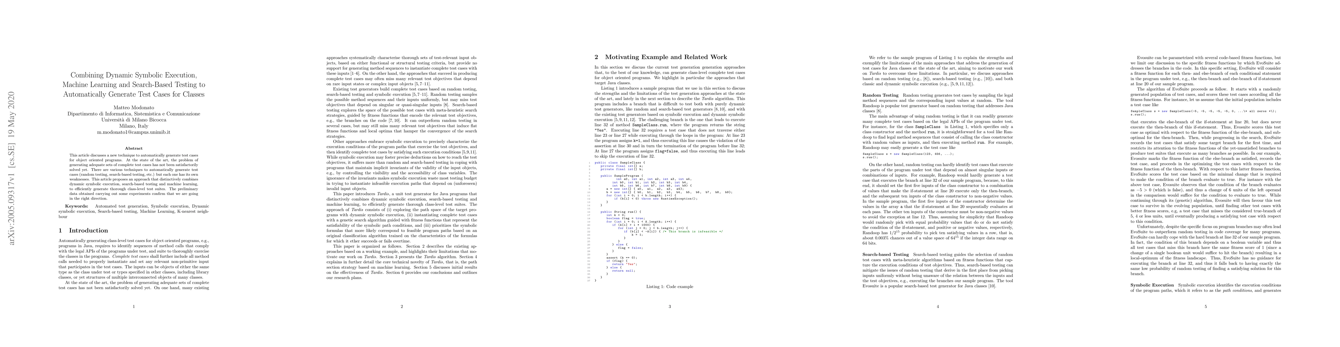 This paper introduces a novel method combining dynamic symbolic execution, search-based testing, and machine learning to automatically generate comprehensive test cases for object-oriented classes. Preliminary experiments suggest the approach effectively addresses the limitations of existing test case generation techniques.