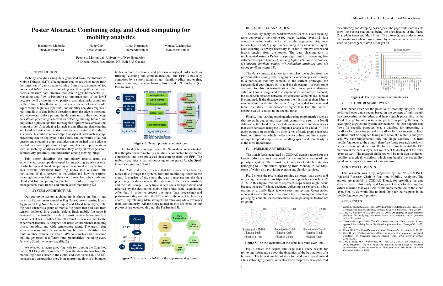 Mobility analytics using data generated from the Internet of Mobile Things (IoMT) is facing many challenges which range from the ingestion of data streams coming from a vast number of fog nodes and IoMT devices to avoiding overflowing the cloud with useless massive data streams that can trigger bottlenecks [1]. Managing data flow is becoming an important part of the IoMT because it will dictate in which platform analytical tasks should run in the future. Data flows are usually a sequence of out-of-order tuples with a high data input rate, and mobility analytics requires a real-time flow of data in both directions, from the edge to the cloud, and vice-versa. Before pulling the data streams to the cloud, edge data stream processing is needed for detecting missing, broken, and duplicated tuples in addition to recognize tuples whose arrival time is out of order. Analytical tasks such as data filtering, data cleaning and low-level data contextualization can be executed at the edge of a network. In contrast, more complex analytical tasks such as graph processing can be deployed in the cloud, and the results of ad-hoc queries and streaming graph analytics can be pushed to the edge as needed by a user application. Graphs are efficient representations used in mobility analytics because they unify knowledge about connectivity, proximity and interaction among moving things. This poster describes the preliminary results from our experimental prototype developed for supporting transit systems, in which edge and cloud computing are combined to process transit data streams forwarded from fog nodes into a cloud. The motivation of this research is to understand how to perform meaningfulness mobility analytics on transit feeds by combining cloud and fog computing architectures in order to improve fleet management, mass transit and remote asset monitoring