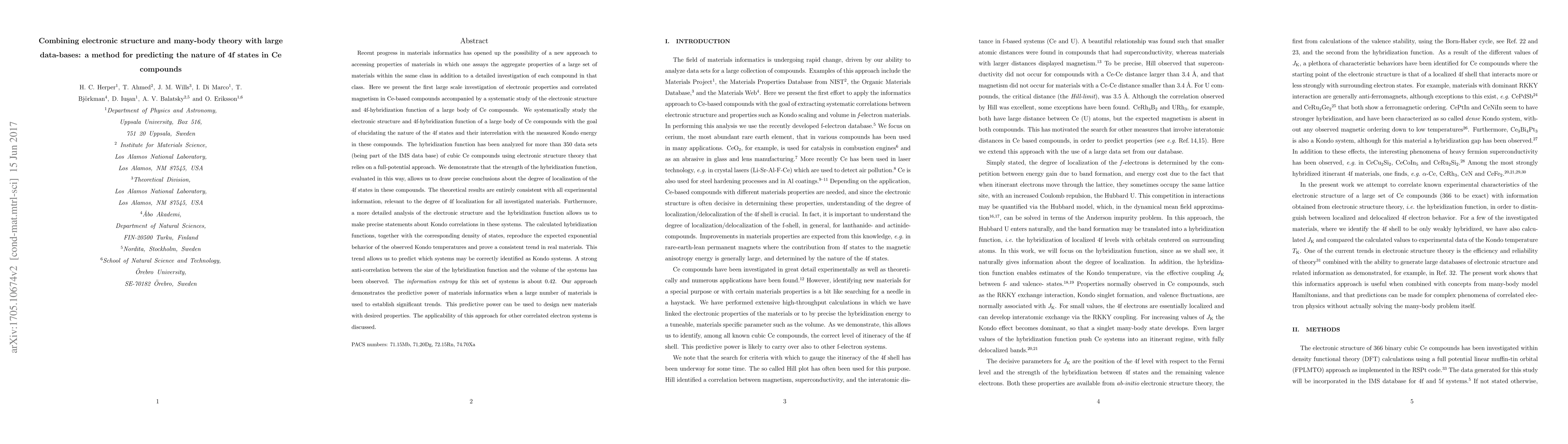 Researchers used large datasets to study electronic structure and 4f states in Ce compounds, finding a correlation between hybridization function strength and Kondo energy, allowing for predictions of material properties.
