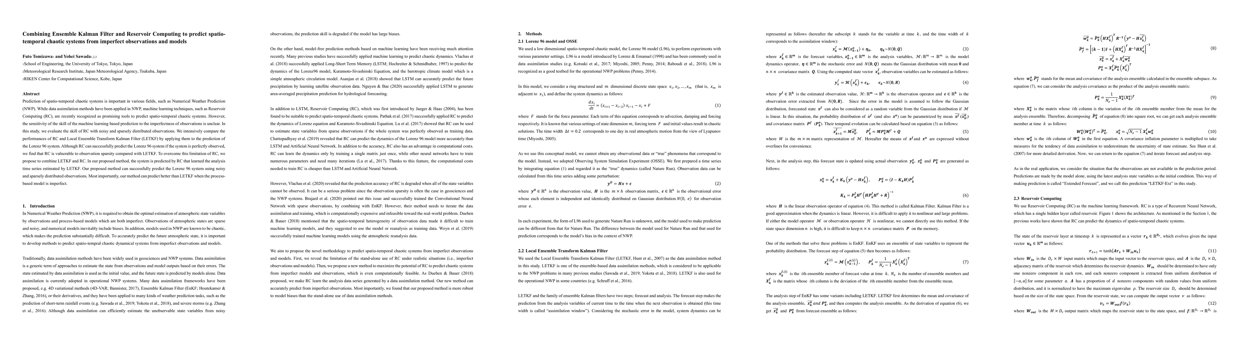 This paper combines Ensemble Kalman Filter (LETKF) and Reservoir Computing (RC) to improve predictions of spatio-temporal chaotic systems like the Lorenz 96 system, especially under noisy and sparse observations. While RC shows promise with perfect data, it struggles with imperfect observations, but the proposed hybrid method combining LETKF and RC effectively predicts the system even under these conditions.