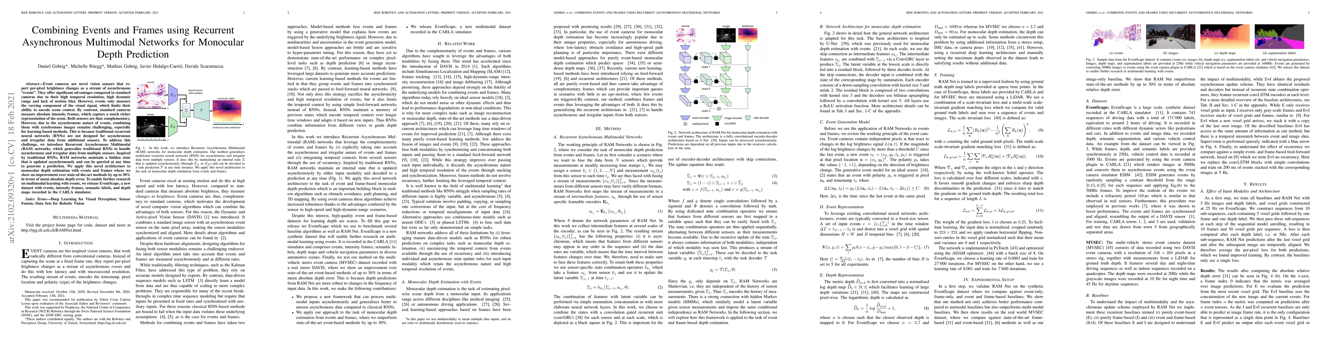 Event cameras are novel vision sensors that report per-pixel brightness changes as a stream of asynchronous "events". They offer significant advantages compared to standard cameras due to their high temporal resolution, high dynamic range and lack of motion blur. However, events only measure the varying component of the visual signal, which limits their ability to encode scene context. By contrast, standard cameras measure absolute intensity frames, which capture a much richer representation of the scene. Both sensors are thus complementary. However, due to the asynchronous nature of events, combining them with synchronous images remains challenging, especially for learning-based methods. This is because traditional recurrent neural networks (RNNs) are not designed for asynchronous and irregular data from additional sensors. To address this challenge, we introduce Recurrent Asynchronous Multimodal (RAM) networks, which generalize traditional RNNs to handle asynchronous and irregular data from multiple sensors. Inspired by traditional RNNs, RAM networks maintain a hidden state that is updated asynchronously and can be queried at any time to generate a prediction. We apply this novel architecture to monocular depth estimation with events and frames where we show an improvement over state-of-the-art methods by up to 30% in terms of mean absolute depth error. To enable further research on multimodal learning with events, we release EventScape, a new dataset with events, intensity frames, semantic labels, and depth maps recorded in the CARLA simulator.
