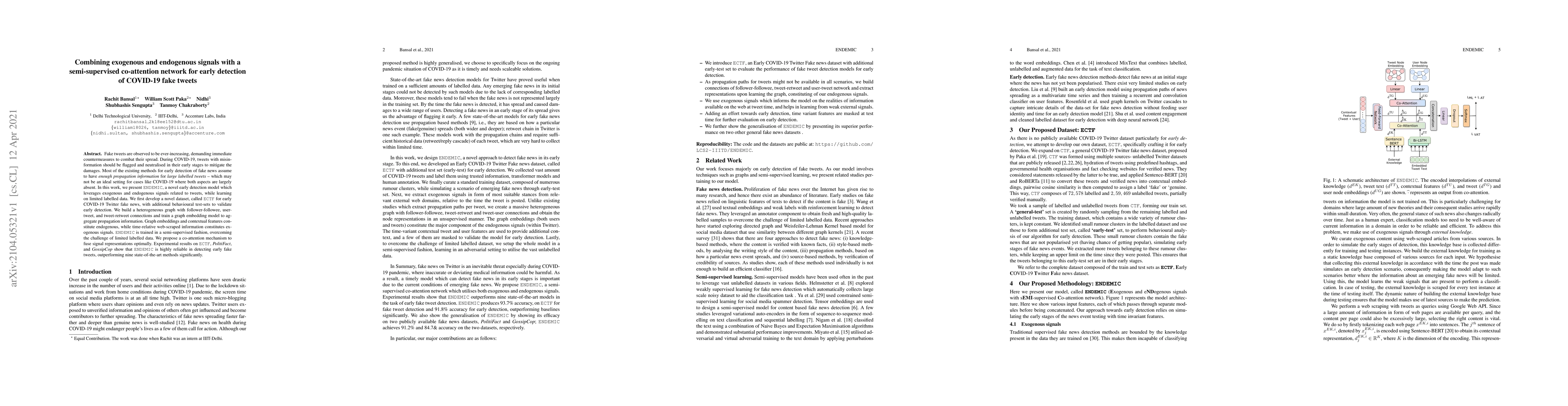 This paper introduces ENDEMIC, a semi-supervised co-attention network combining exogenous and endogenous signals for early detection of COVID-19 fake tweets. The model leverages limited labeled data and outperforms nine state-of-the-art methods, demonstrating high reliability in identifying early misinformation.