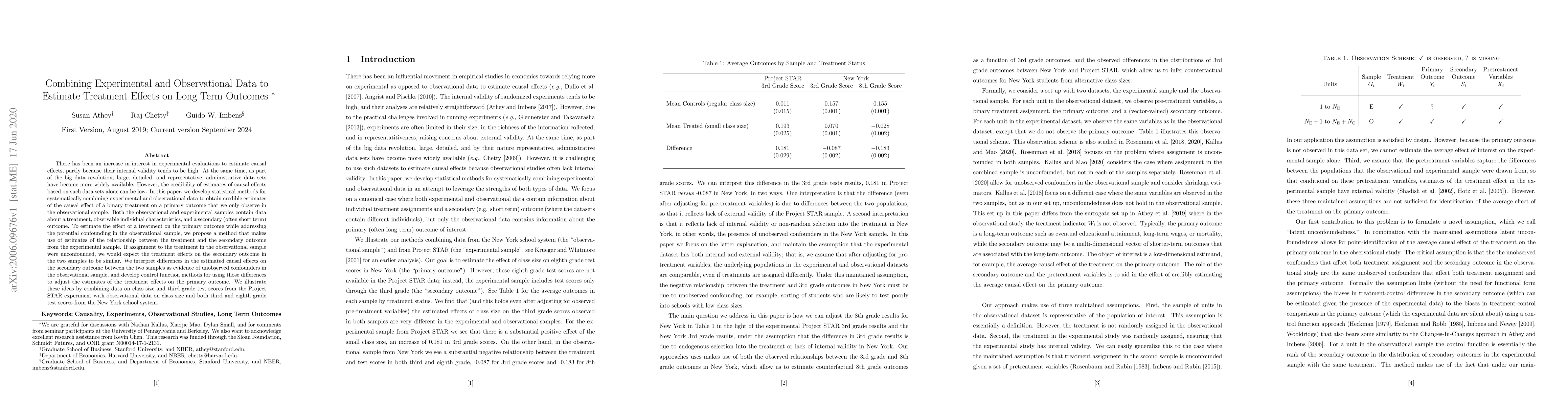 This paper proposes statistical methods to combine experimental and observational data for credible estimates of treatment effects on long-term outcomes, addressing potential confounding in observational samples by using control functions based on differences in estimated causal effects on secondary outcomes. The method is demonstrated using class size data from the Project STAR experiment and the New York school system.