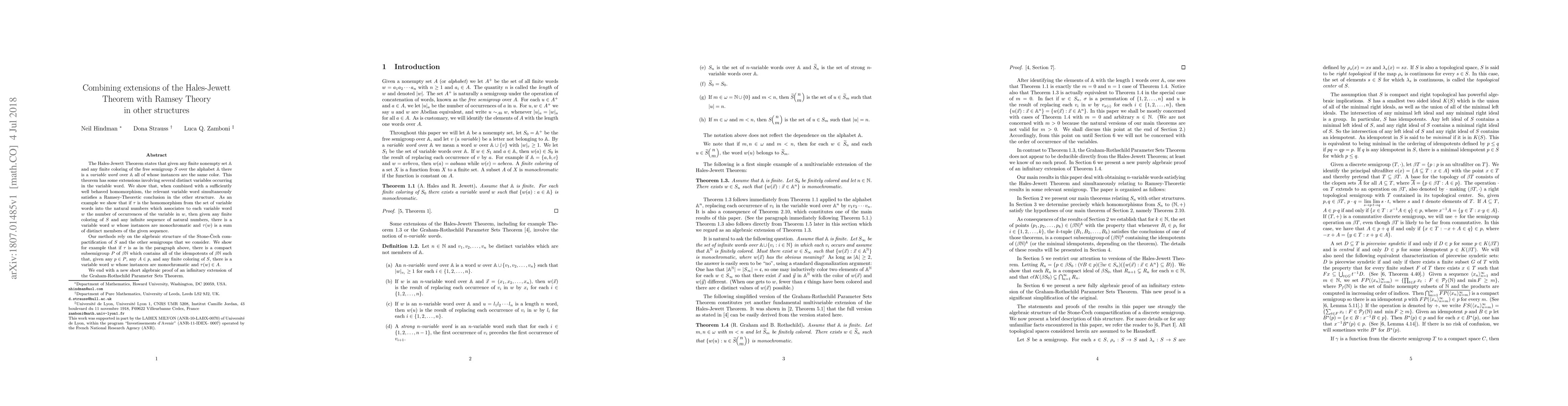 The Hales-Jewett Theorem states that given any finite nonempty set $\A$ and any finite coloring of the free semigroup $S$ over the alphabet $\A$ there is a {\it variable word\/} over $\A$ all of whose instances are the same color. This theorem has some extensions involving several distinct variables occurring in the variable word. We show that, when combined with a sufficiently well behaved homomorphism, the relevant variable word simultaneously satisfies a Ramsey-Theoretic conclusion in the other structure. As an example we show that if $\tau$ is the homomorphism from the set of variable words into the natural numbers which associates to each variable word $w$ the number of occurrences of the variable in $w$, then given any finite coloring of $S$ and any infinite sequence of natural numbers, there is a variable word $w$ whose instances are monochromatic and $\tau(w)$ is a sum of distinct members of the given sequence. Our methods rely on the algebraic structure of the Stone-\v Cech compactification of $S$ and the other semigroups that we consider. We show for example that if $\tau$ is as in the paragraph above, there is a compact subsemigroup $P$ of $\beta\ben$ which contains all of the idempotents of $\beta\ben$ such that, given any $p\in P$, any $A\in p$, and any finite coloring of $S$, there is a variable word $w$ whose instances are monochromatic and $\tau(w)\in A$. We end with a new short algebraic proof of an infinitary extension of the Graham-Rothschild Parameter Sets Theorem.