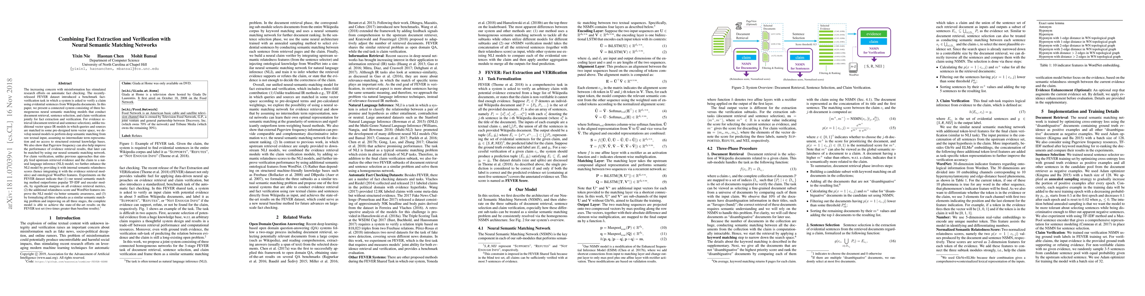 The increasing concern with misinformation has stimulated research efforts on automatic fact checking. The recently-released FEVER dataset introduced a benchmark fact-verification task in which a system is asked to verify a claim using evidential sentences from Wikipedia documents. In this paper, we present a connected system consisting of three homogeneous neural semantic matching models that conduct document retrieval, sentence selection, and claim verification jointly for fact extraction and verification. For evidence retrieval (document retrieval and sentence selection), unlike traditional vector space IR models in which queries and sources are matched in some pre-designed term vector space, we develop neural models to perform deep semantic matching from raw textual input, assuming no intermediate term representation and no access to structured external knowledge bases. We also show that Pageview frequency can also help improve the performance of evidence retrieval results, that later can be matched by using our neural semantic matching network. For claim verification, unlike previous approaches that simply feed upstream retrieved evidence and the claim to a natural language inference (NLI) model, we further enhance the NLI model by providing it with internal semantic relatedness scores (hence integrating it with the evidence retrieval modules) and ontological WordNet features. Experiments on the FEVER dataset indicate that (1) our neural semantic matching method outperforms popular TF-IDF and encoder models, by significant margins on all evidence retrieval metrics, (2) the additional relatedness score and WordNet features improve the NLI model via better semantic awareness, and (3) by formalizing all three subtasks as a similar semantic matching problem and improving on all three stages, the complete model is able to achieve the state-of-the-art results on the FEVER test set.