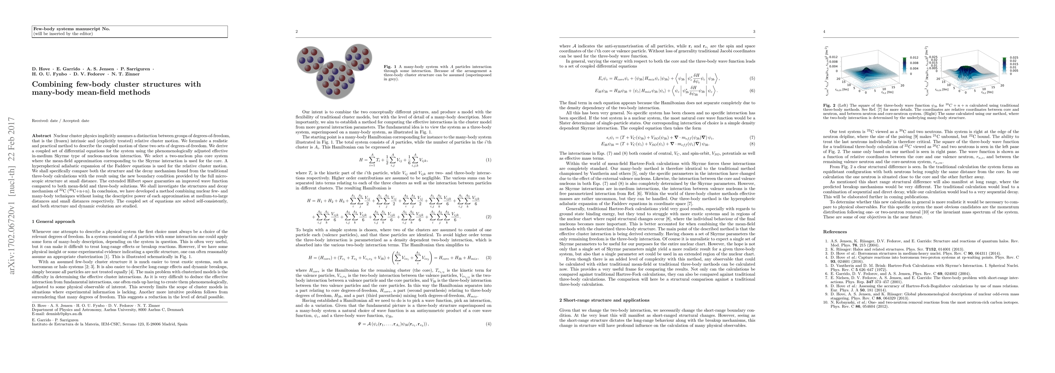 Nuclear cluster physics implicitly assumes a distinction between groups of degrees-of-freedom, that is the (frozen) intrinsic and (explicitly treated) relative cluster motion. We formulate a realistic and practical method to describe the coupled motion of these two sets of degrees-of-freedom. We derive a coupled set of differential equations for the system using the phenomenologically adjusted effective in-medium Skyrme type of nucleon-nucleon interaction. We select a two-nucleon plus core system where the mean-field approximation corresponding to the Skyrme interaction is used for the core. A hyperspherical adiabatic expansion of the Faddeev equations is used for the relative cluster motion. We shall specifically compare both the structure and the decay mechanism found from the traditional three-body calculations with the result using the new boundary condition provided by the full microscopic structure at small distance. The extended Hilbert space guaranties an improved wave function compared to both mean-field and three-body solutions. We shall investigate the structures and decay mechanism of $^{22}$C ($^{20}$C+n+n). In conclusion, we have developed a method combining nuclear few- and many-body techniques without losing the descriptive power of each approximation at medium-to-large distances and small distances respectively. The coupled set of equations are solved self-consistently, and both structure and dynamic evolution are studied.