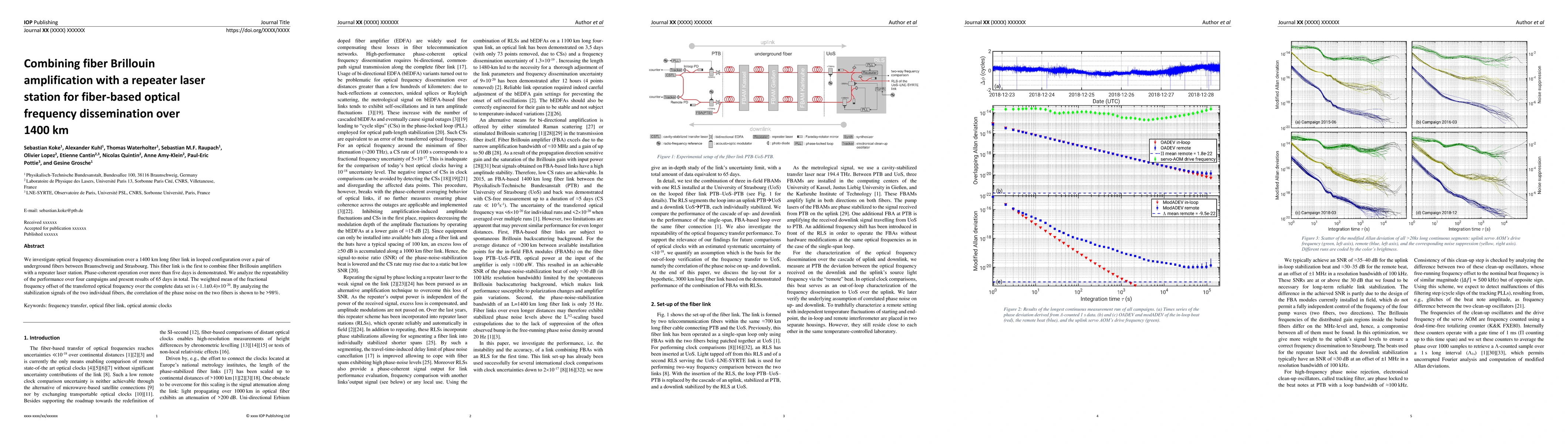 This paper explores the use of fiber Brillouin amplifiers and a repeater laser station for optical frequency dissemination over a 1400 km fiber link between Braunschweig and Strasbourg. The setup demonstrates phase-coherent operation over five days and shows a weighted mean fractional frequency offset of $(-1.1 \pm 0.4) \times 10^{-20}$ over 65 days, with high correlation (>98%) in phase noise between the two fibers.