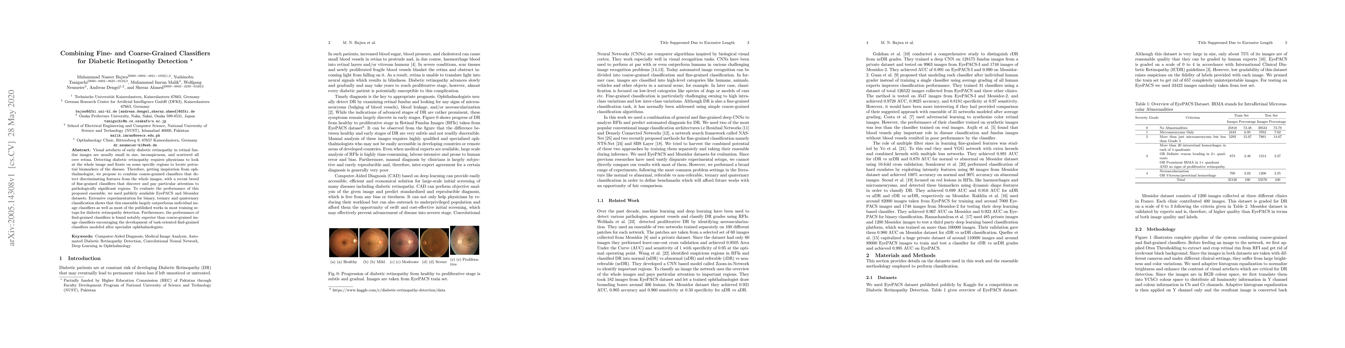 Visual artefacts of early diabetic retinopathy in retinal fundus images are usually small in size, inconspicuous, and scattered all over retina. Detecting diabetic retinopathy requires physicians to look at the whole image and fixate on some specific regions to locate potential biomarkers of the disease. Therefore, getting inspiration from ophthalmologist, we propose to combine coarse-grained classifiers that detect discriminating features from the whole images, with a recent breed of fine-grained classifiers that discover and pay particular attention to pathologically significant regions. To evaluate the performance of this proposed ensemble, we used publicly available EyePACS and Messidor datasets. Extensive experimentation for binary, ternary and quaternary classification shows that this ensemble largely outperforms individual image classifiers as well as most of the published works in most training setups for diabetic retinopathy detection. Furthermore, the performance of fine-grained classifiers is found notably superior than coarse-grained image classifiers encouraging the development of task-oriented fine-grained classifiers modelled after specialist ophthalmologists.