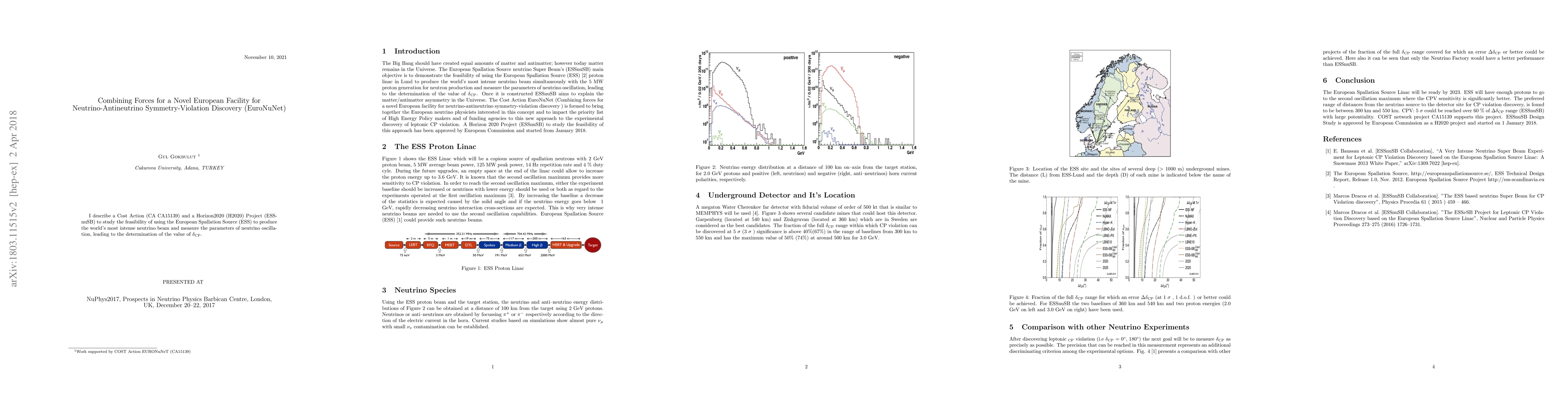 The Big Bang should have created equal amounts of matter and antimatter; however today matter remains in the Universe. The European Spallation Source neutrino Super Beam's (ESSnuSB) main objective is to demonstrate the feasibility of using the European Spallation Source (ESS) proton linac to produce the world's most intense neutrino beam simultaneously with the 5 MW proton generation for neutron production and measure the parameters of the neutrino oscillation, leading to the determination of the value of ${\delta}CP$. Once it is constructed ESSnuSB project aims to explain the matter/antimatter asymmetry in the Universe. The Cost Action EuroNuNet's (Combining forces for a novel European facility for neutrino-antineutrino symmetry-violation discovery ) major goals are to bring together the European neutrino physicists to study this concept in a spirit of inclusiveness and to impact the priority list of High Energy Physics policy makers and of funding agencies to this new approach to the experimental discovery of leptonic CP violation.