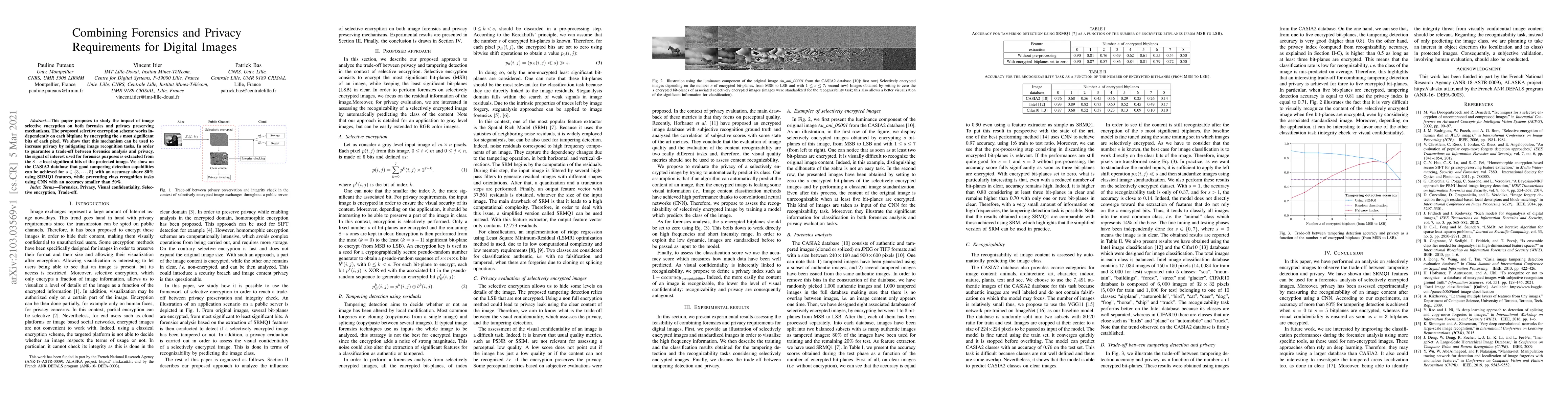 This paper explores a selective encryption method for digital images that balances forensic analysis and privacy. The method encrypts the most significant bits of each pixel while preserving the least significant bits for forensic purposes, achieving high tampering detection accuracy while significantly reducing image recognition accuracy.