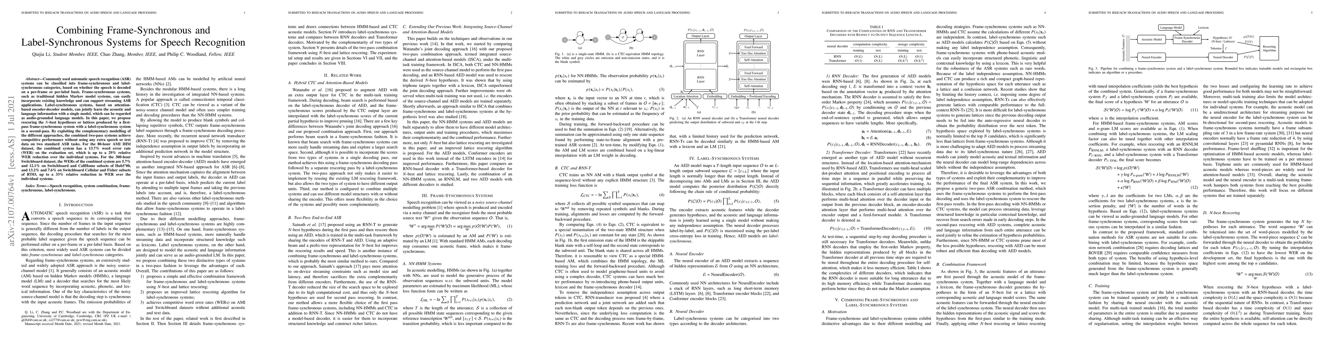 This paper proposes combining frame-synchronous and label-synchronous systems for improved automatic speech recognition (ASR). The combined two-pass system rescores N-best hypotheses from a first-pass frame-synchronous system with a label-synchronous system, achieving up to a 33% relative reduction in word error rate on multiple datasets.