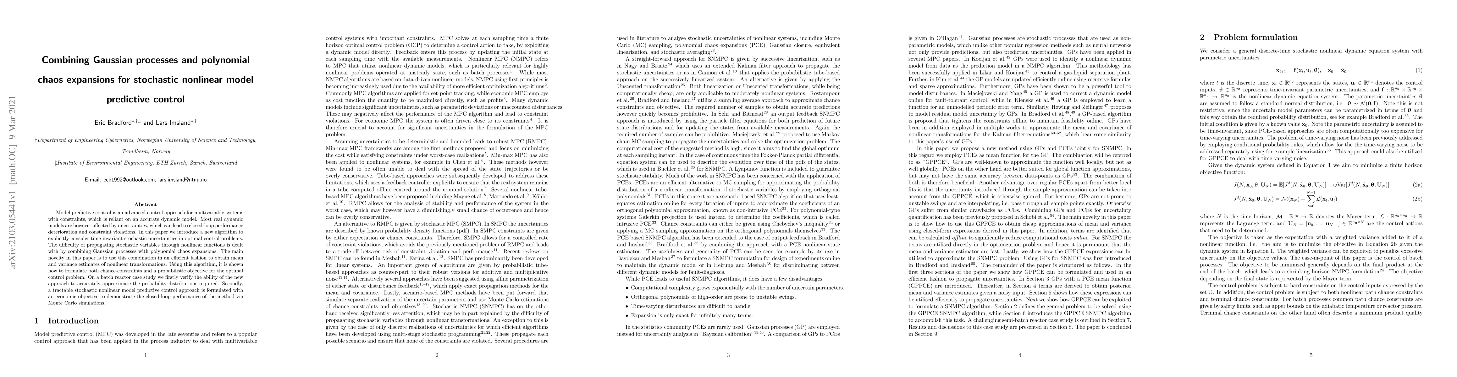 Model predictive control is an advanced control approach for multivariable systems with constraints, which is reliant on an accurate dynamic model. Most real dynamic models are however affected by uncertainties, which can lead to closed-loop performance deterioration and constraint violations. In this paper we introduce a new algorithm to explicitly consider time-invariant stochastic uncertainties in optimal control problems. The difficulty of propagating stochastic variables through nonlinear functions is dealt with by combining Gaussian processes with polynomial chaos expansions. The main novelty in this paper is to use this combination in an efficient fashion to obtain mean and variance estimates of nonlinear transformations. Using this algorithm, it is shown how to formulate both chance-constraints and a probabilistic objective for the optimal control problem. On a batch reactor case study we firstly verify the ability of the new approach to accurately approximate the probability distributions required. Secondly, a tractable stochastic nonlinear model predictive control approach is formulated with an economic objective to demonstrate the closed-loop performance of the method via Monte Carlo simulations.