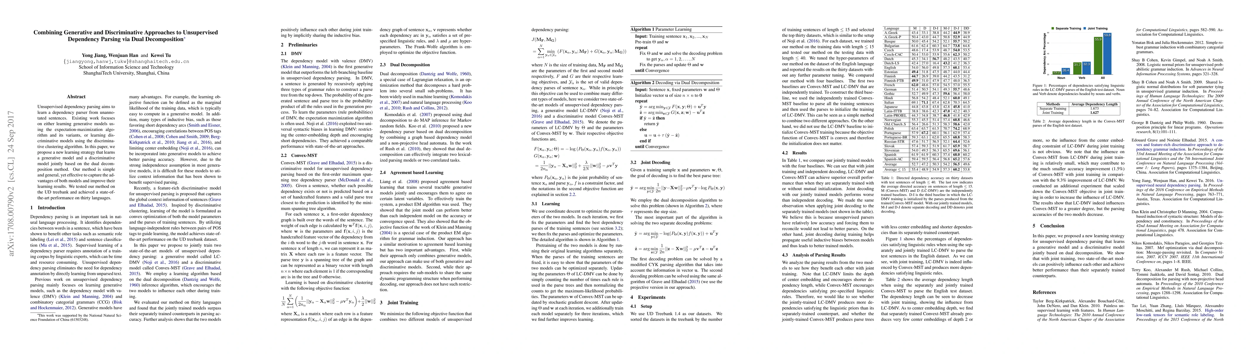 This paper proposes a novel method combining generative and discriminative approaches for unsupervised dependency parsing using dual decomposition. The method effectively integrates both models to achieve state-of-the-art performance on the UD treebank across thirty languages.
