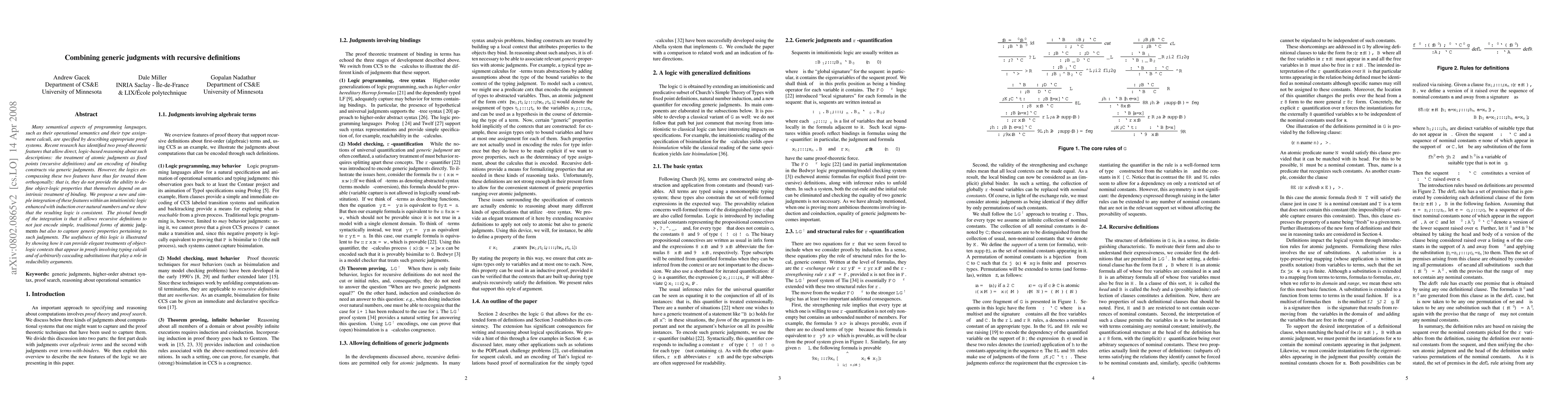 This paper proposes a new integration of recursive definitions and generic judgments within an intuitionistic logic, demonstrating its consistency. The integrated logic allows recursive definitions to capture generic properties, enhancing the treatment of typing calculi and reducibility arguments in programming languages.