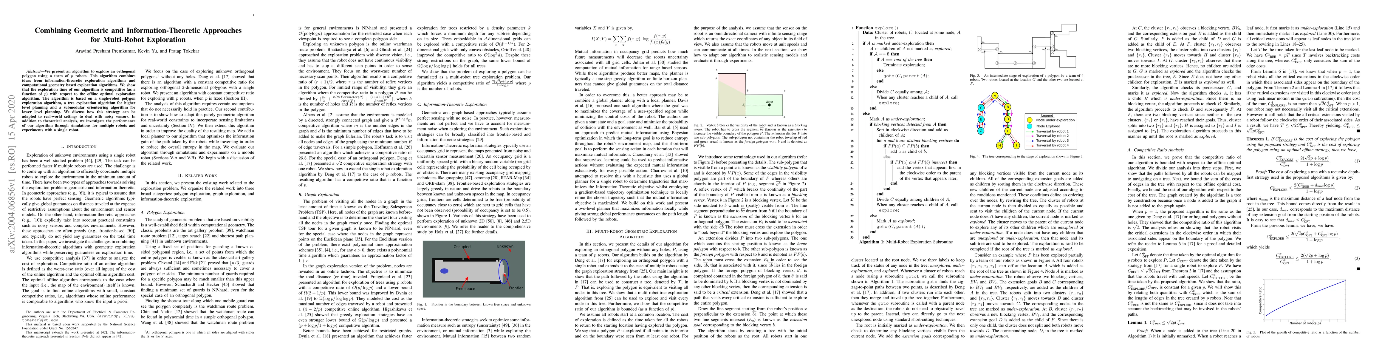 This paper proposes an algorithm combining geometric and information-theoretic methods for multi-robot exploration of orthogonal polygons, showing competitive exploration time relative to optimal offline algorithms. The approach integrates single-robot, tree, and submodular orienteering strategies, with adaptations for real-world noise and validated through simulations and experiments.